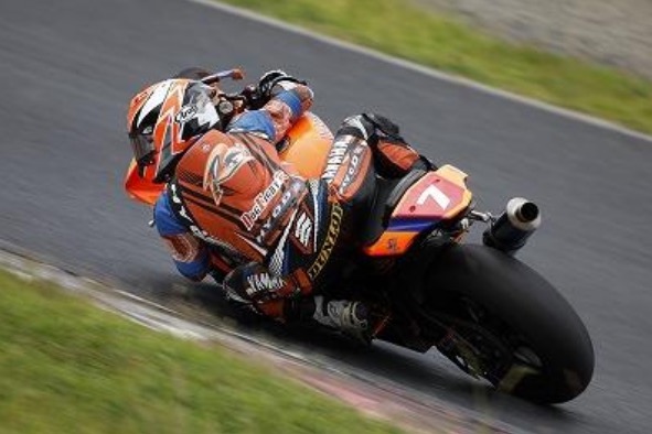 決勝レースは6番グリッドから発信して6番手のまま1コーナーに進入。2周目の裏ストレート後のヘアピンのブレーキングで5番手に浮上しますが、次のコーナーで抜いた選手と接触し7番手に落ちてしまいました。接触した際に左足のブーツのバンドが緩んでしまい、踏ん張るのが困難な状況になりました。またレース序盤からサスセットを詰め切れなかった事によりコーナー中にフロントタイヤがハネてしまい攻めるのも困難な状況でした。その中で何とか誤魔化しながらペースを保ち、限界付近での走りを続け、ラスト5周あたりで前のライダーに追いつきダブルヘアピン1個目の進入のブレーキング勝負で前に出ましたが、フロントがハネてしまい止まりきれず、そこで勝負ありとなり7位でチェッカーを受けました。
