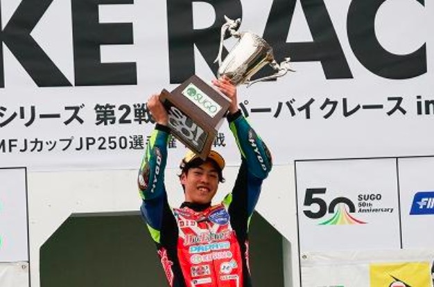 今年の初めは不運なことが続き怪我までしてしまい開幕戦の菅生大会は痛みに耐えながら走行していました。レースでは、雨が降ってくれたおかげで少し痛みが和らぐようになりとても自分的には良いコンディションとなりました。レース中もトップ争いをしていた2台のライダーがクラッシュした影響により、2つポジションを上げられ1位でチェッカーを受けることができました。