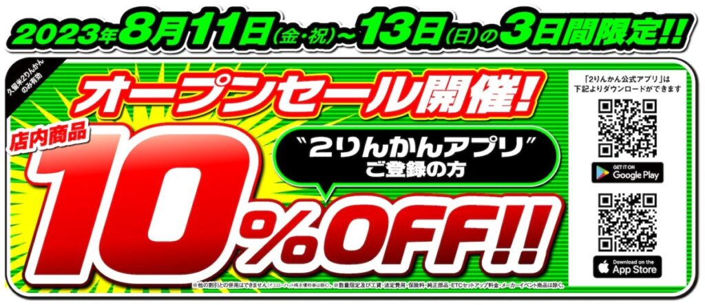 オープンセールは、2023年8月11日(金祝)から8月13日(日)まで開催します。2りんかんアプリにご登録の方限定で店内商品が全品10%OFF(一部商品を除く)となるオープンセールを実施。さらにオープン記念として、数量限定のヘルメットやウエア、タイヤなどお買い得な商品をご用意しております。