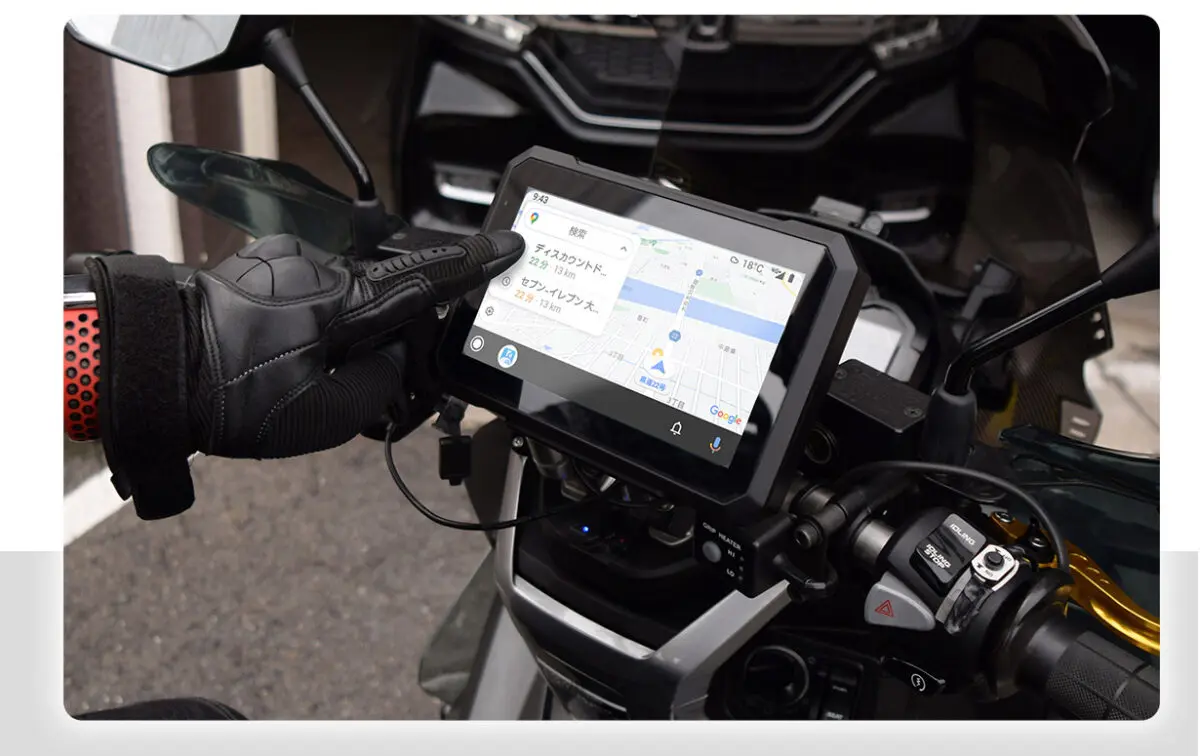バイク用の7インチポータブルディスプレイオーディオ。Android Auto、Car Play対応のスマートフォンから無線で接続可能。