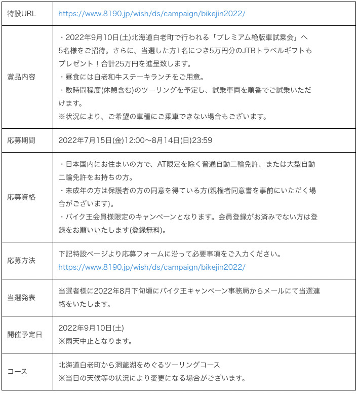 株式会社バイク王&カンパニーは、2022年9月10日(土)に北海道白老町にて、『プレミアム絶版車試乗会in北海道・白老』を開催すると発表した。参加者数は応募者の中から抽選で5名となり、今回の北海道白老町で行う絶版車試乗会は、5万円分のJTBトラベルギフトと、北海道の豊かな自然が育んだ白老和牛のステーキランチも堪能できる、プレミアムな試乗会となっている。
