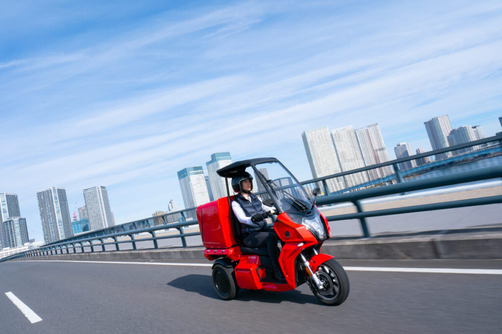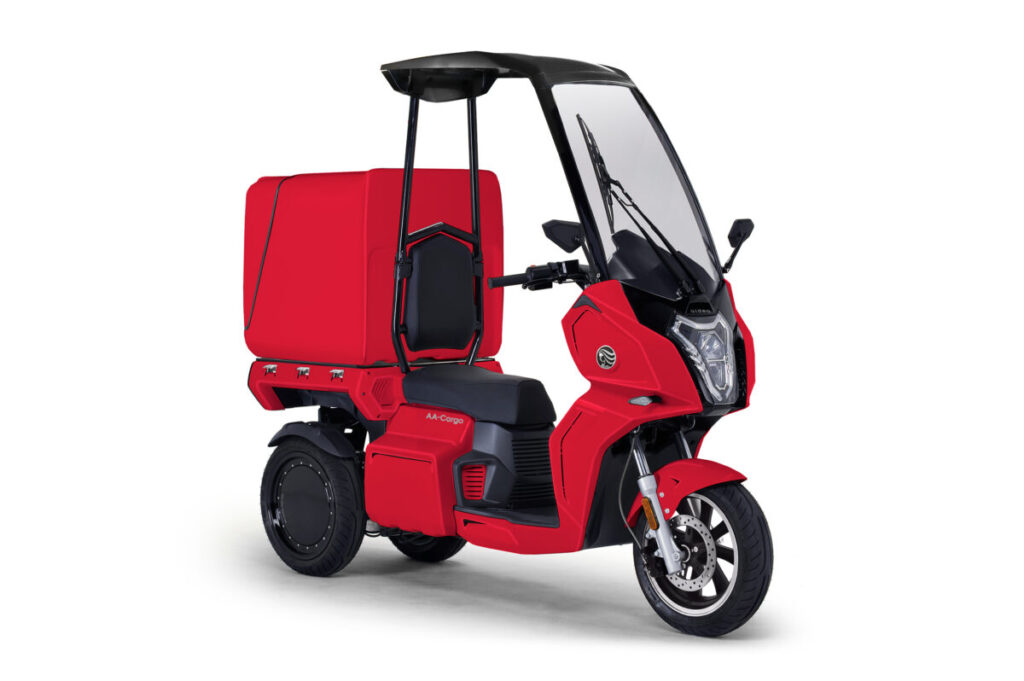 2022年2月に国土交通省による型式認定を取得し、国内第5のバイクメーカー誕生として話題になった電動3輪バイクが「AAカーゴ」です。3輪構造による走行安定性と、スクリーンとルーフによる快適性が高く評価され、日本マクドナルド、日本郵便、DHLジャパンなど、さまざまな企業に採用されています。