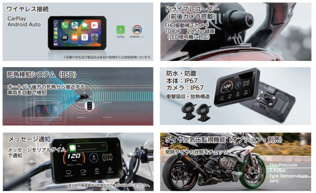 同製品は、ディスプレイオーディオとドライブレコーダーがセットとなっており、街乗りはもちろんツーリングに最適なアイテムである。地図やメッセージ、音楽アプリの操作などをモニターで行うことができるほか、リアモニターとしても利用が可能。また、ドライブレコーダーの動画はモニター本体とスマートフォンでも確認や編集を行うことができる。本体は、IP67防水仕様、放熱性・耐久性・軽量化を考慮したフレームで過酷な環境下にも対応できる仕様だ。別売りアクセサリーも豊富にラインナップされているため、自分好みにアレンジしてさらに快適なバイクライフを楽しんでみてはいかがだろうか。