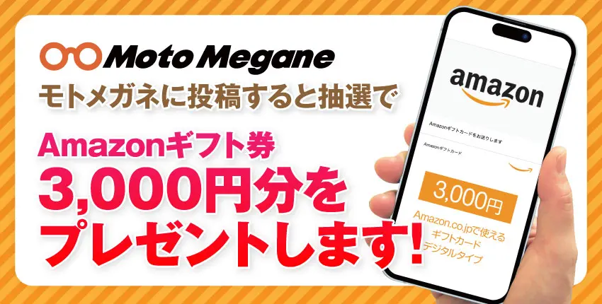 モトメガネでは、WEBサイトに投稿するともらえるお得なキャンペーンを開催中!モトメガネのサイトにある投稿ページから、あなたのバイク情報、ツーリング情報、または過去に所有した思い出の愛車を投稿すると、抽選でAmazon.ギフト券3000円分をプレゼントいたします!ぜひご応募ください!