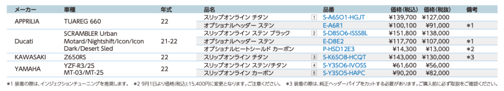 アプリリア トゥアレグ660、ドゥカティ スクランブラー、カワサキ Z650RS、ヤマハ YZF-R25・YZF-R3・MT-25・MT-03など 新型車両用のマフラーが続々とラインナップ!