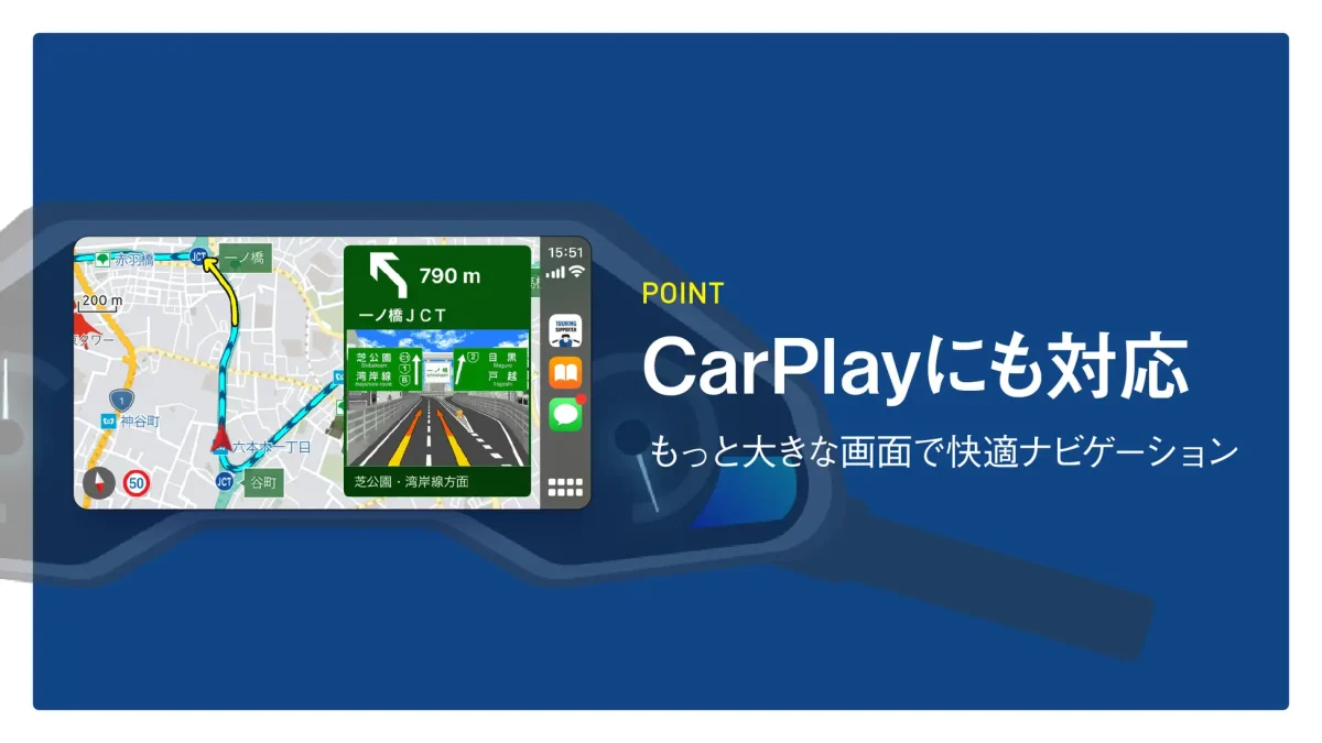 「Apple CarPlay」への対応により、車載ディスプレイと連動することで、バイク車両において、車載ディスプレイに最適化されたUIでのルートの表示および案内が可能になるため、より高い視認性、操作性でご利用になれます。走行中の振動による、バイクからスマートフォンが落下するなどといった不安も解消されます。
