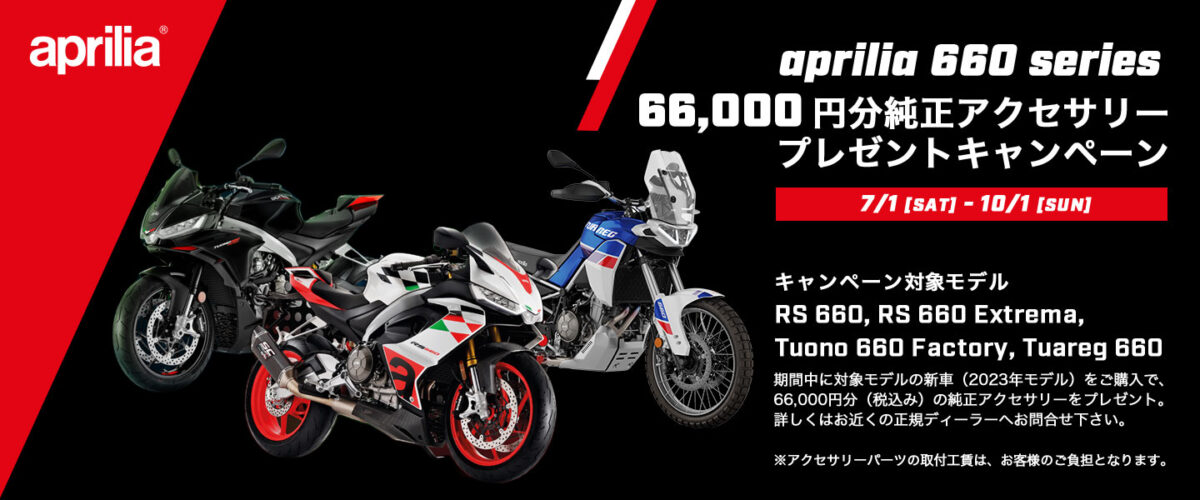 ピアッジオグループジャパン株式会社(本社:東京都港区芝二丁目、代表取締役:ネリ・ミクラウス)は、アプリリアの 660ccモデルのご購入者対象とした、66,000 円(税込)分の純正アクセサリープレゼントキャンペーンを全国のアプリリア正規販売店にて実施いたします。