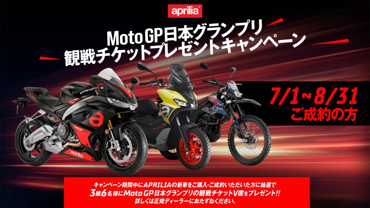 ピアッジオグループジャパン株式会社 (本社:東京都港区芝 2 丁目、代表取締役 ネリ・ミクラウス)は、アプリリアの新車をご購入された方の中から抽選で 3 組 6 名様に、MotoGP 日本グランプリの観戦チケットをプレゼントするキャンペーンを実施しています。