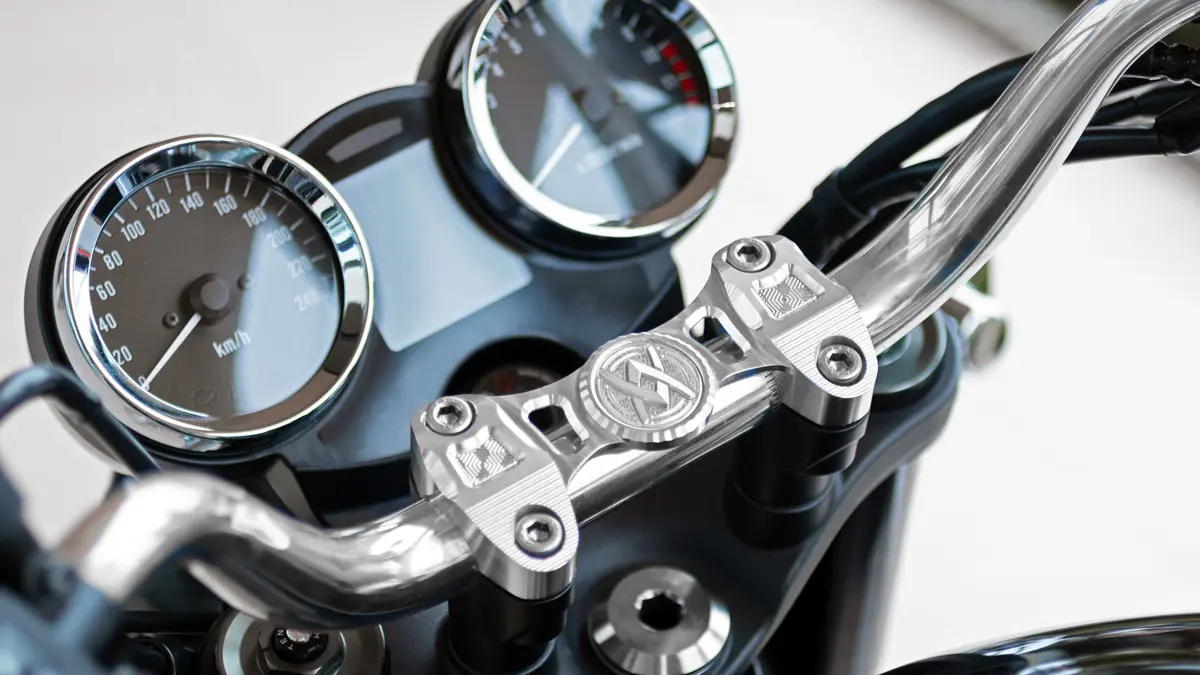 飾り気のない無機質なZ900RS純正のハンドルクランプに対し、ARCHIは中央に削り出しのブランドロゴマークを配置。大胆な肉抜きを経て左右のスペースには象徴であるハニカムパターンをあしらい、テーパーにも変化を加えることでより絢爛な見た目を実現。細やかな切削技術によりどの角度から見ても変化に富む光の反射と造形美を表現している。