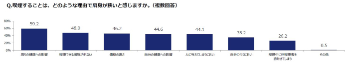 喫煙者(紙巻・加熱式)の88.3%が、喫煙することで「肩身が狭い」と回答しており、その理由として「周囲の健康への影響(59.2%)」や「人に与えてしまうニオイ(44.1%)」、「喫煙中に非喫煙者を待たせてしまう (26.2%)」など、非喫煙者を気遣う故に「肩身が狭い」と感じていることが明らかになりました。また、「喫煙できる場所が少ないこと(48.0%)」も「肩身が狭い」と感じる大きな要因であることが明らかになりました。