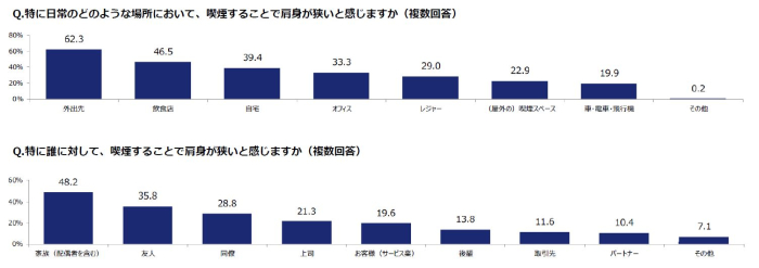 特に日常のどのような場所で肩身が狭いと感じるかという問いに対し、「外出先での喫煙」と回答した人が62.3%と最も多く、次いで「飲食店での喫煙(46.5%)」「自宅での喫煙(39.4%)」であることが明らかになりました。また、誰に対して肩身の狭さを感じるかという問いに対し、「家族」が48.2%と最も多く、次いで「友人(35.8%)」という結果になりました。