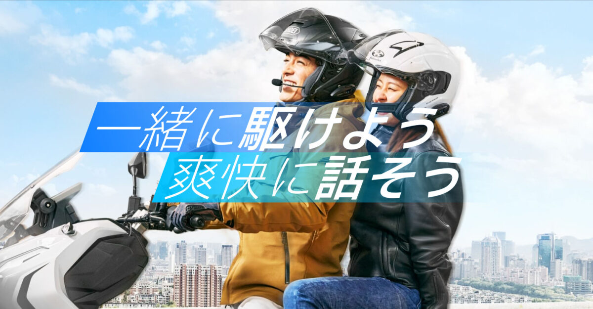 「一緒に駆けよう 爽快に話そう」ヘルメットに取付けることで、バイクに乗りながら気軽に会話を楽しむことができる。
