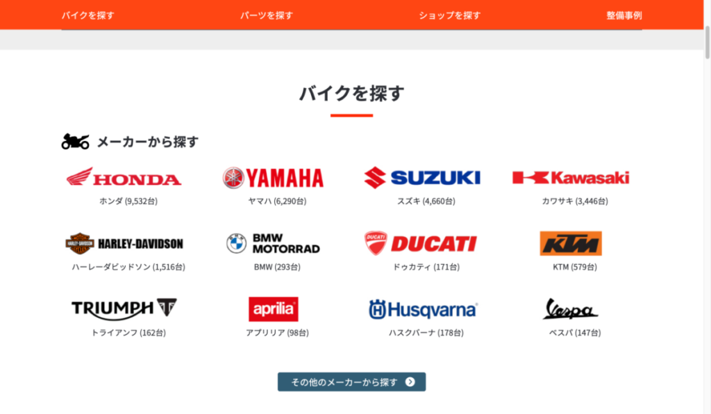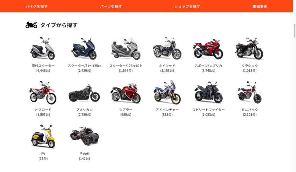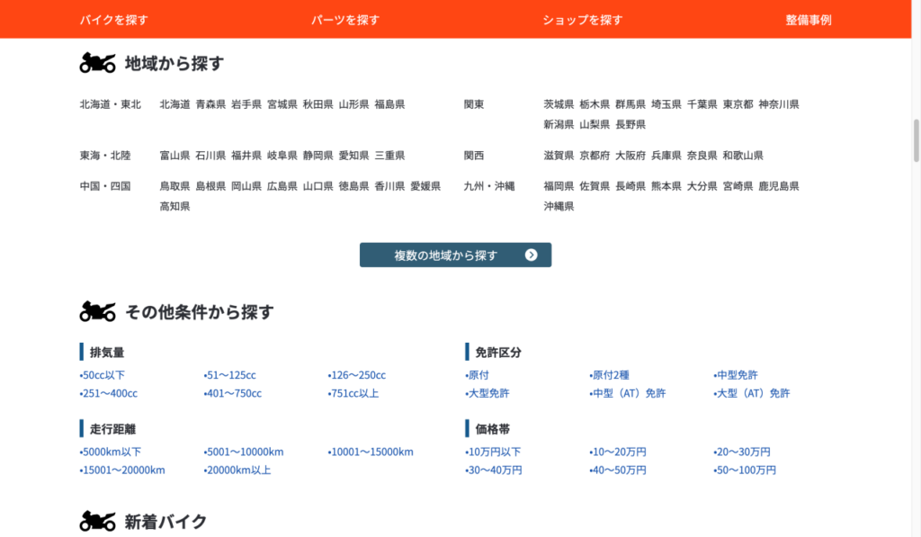 検索方法は、アマゾンや楽天などのインターネット通販サイトや、よく見る中古車検索サイトのように、メーカーから検索したり、タイプ、地域、排気量、免許区分、走行距離、価格帯など細かい項目から探すことが可能