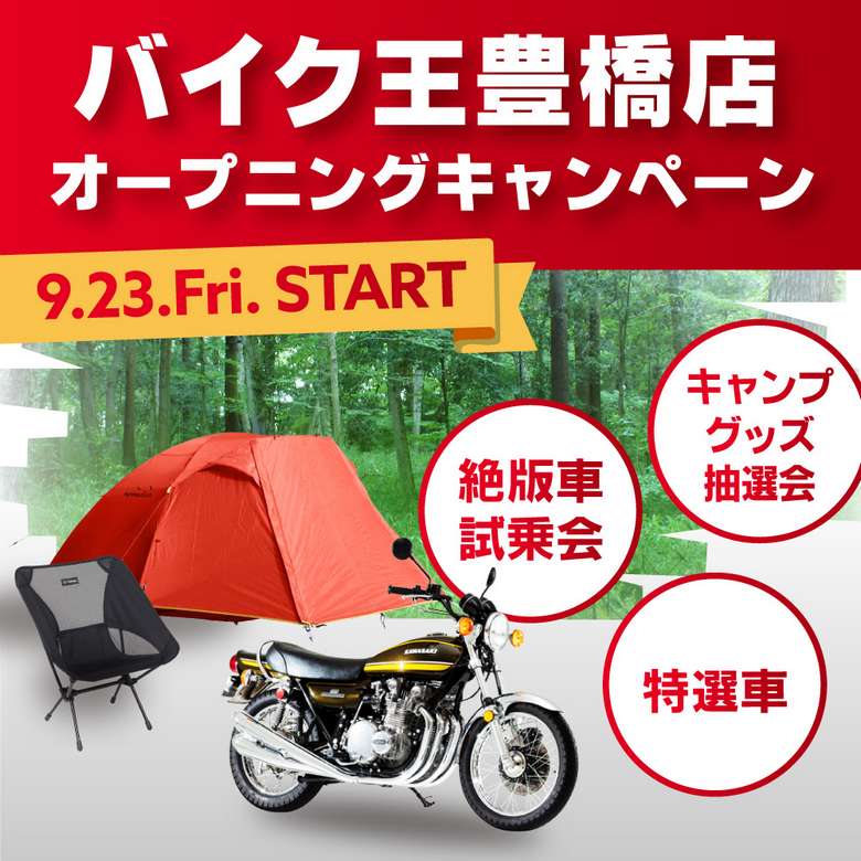 9月23日(金)と9月24日(土)は、参加無料のキャンプグッズ抽選会と絶版車試乗会を開催※1する。来場の皆様にご参加いただけるキャンプグッズ抽選会で当たる景品は、人気のテンマクデザインのテントやヘリノックスの折り畳みチェア、ランタン等となっている。また、抽選会に参加した方全員に素敵なプレゼントが用意されている。絶版車試乗会※2は、カワサキZ1、ホンダNS400R、ヤマハRZ350を用意し、今なお根強い人気を誇る名車を試乗できる。これらはすべて、実際にお客様からお譲りいただいた車両で、バイク王のテクニカルアドバイザー(整備スタッフ)の整備によりベストなコンディションに仕上げている。