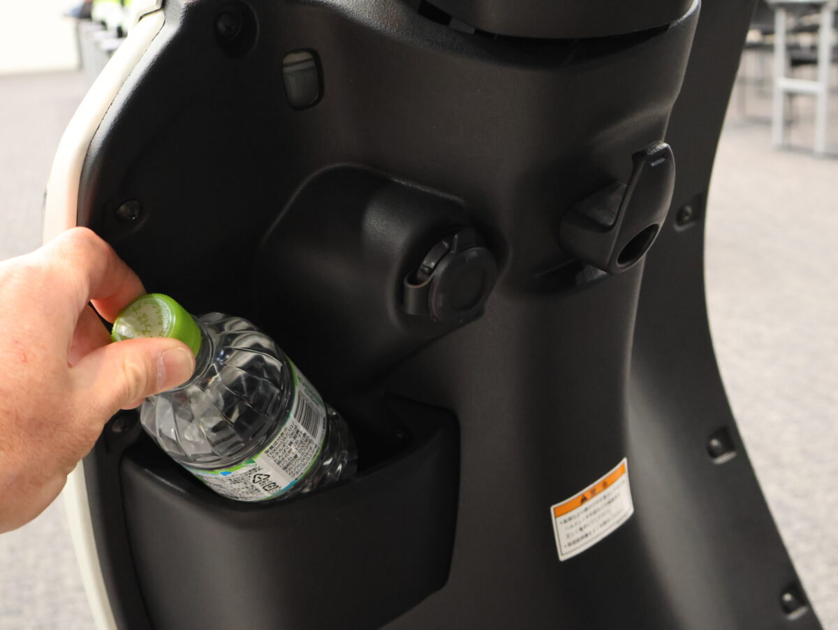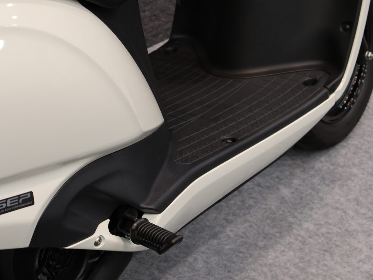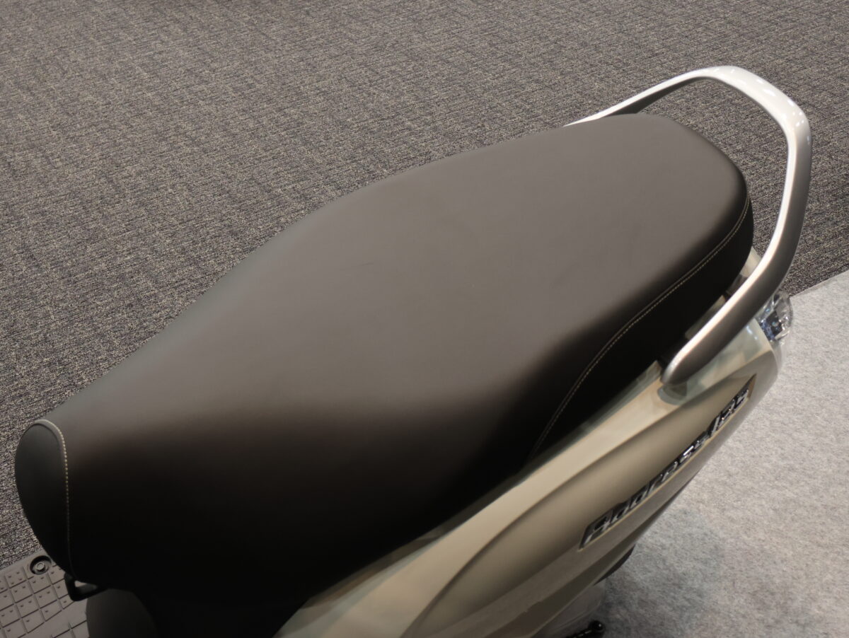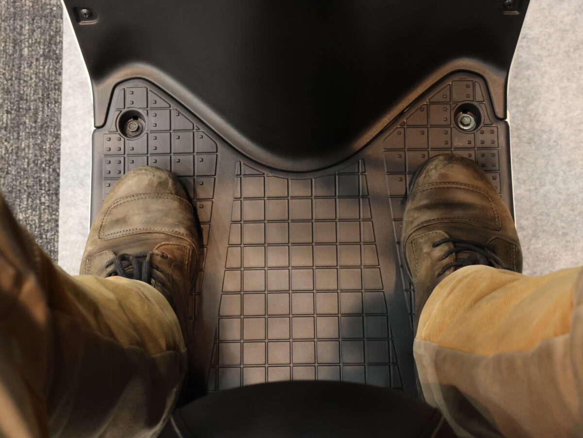 シート高は770㎜と低めのなうえ、シートの前方がしっかりと絞られているため足が出しやすく、踵までべったりとつけられた。フロアボードはセンタートンネルのないフルフラット構造に加え、下部に燃料タンクがないおかげで低床で足も乗せやすい。ちょっとした荷物を乗せられるのはもちろんだが、服装を選ばず乗ることができるのが素晴らしい。