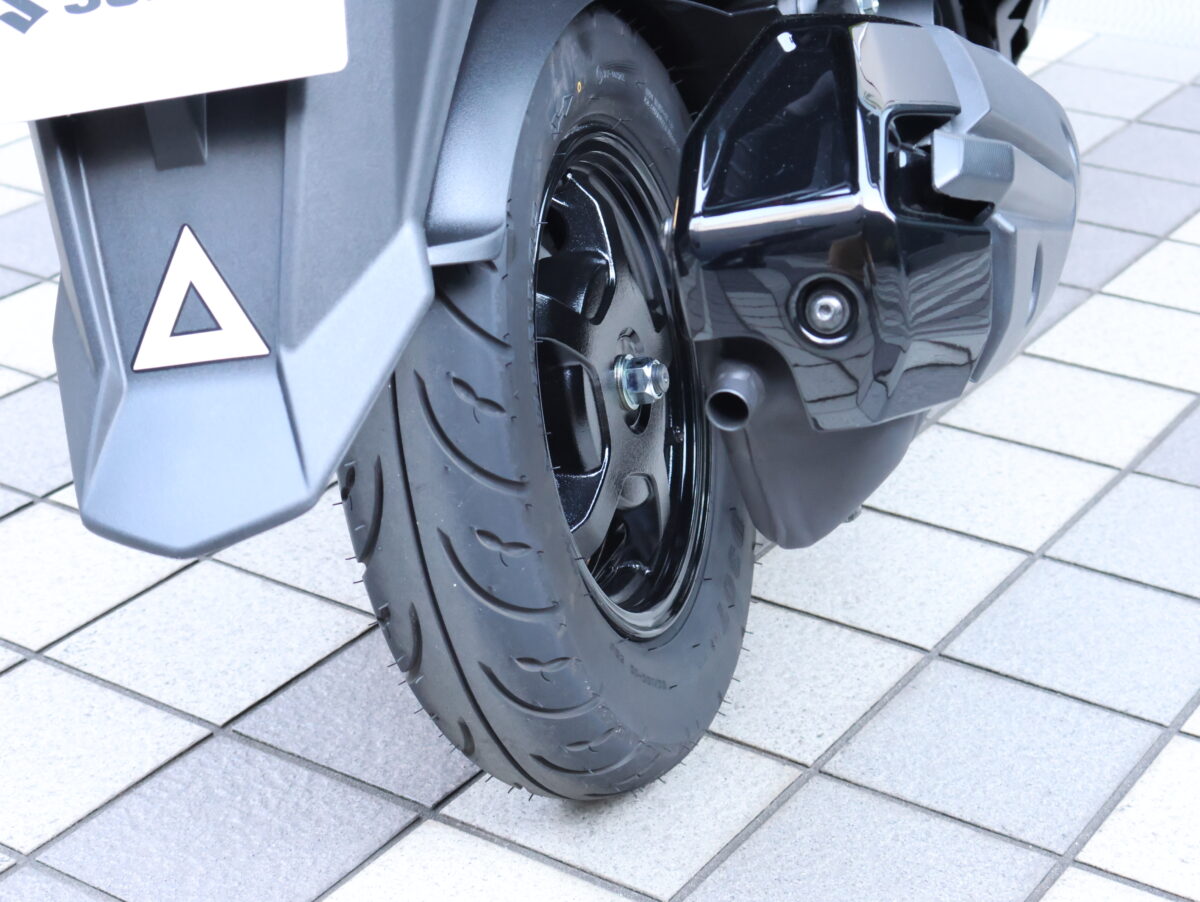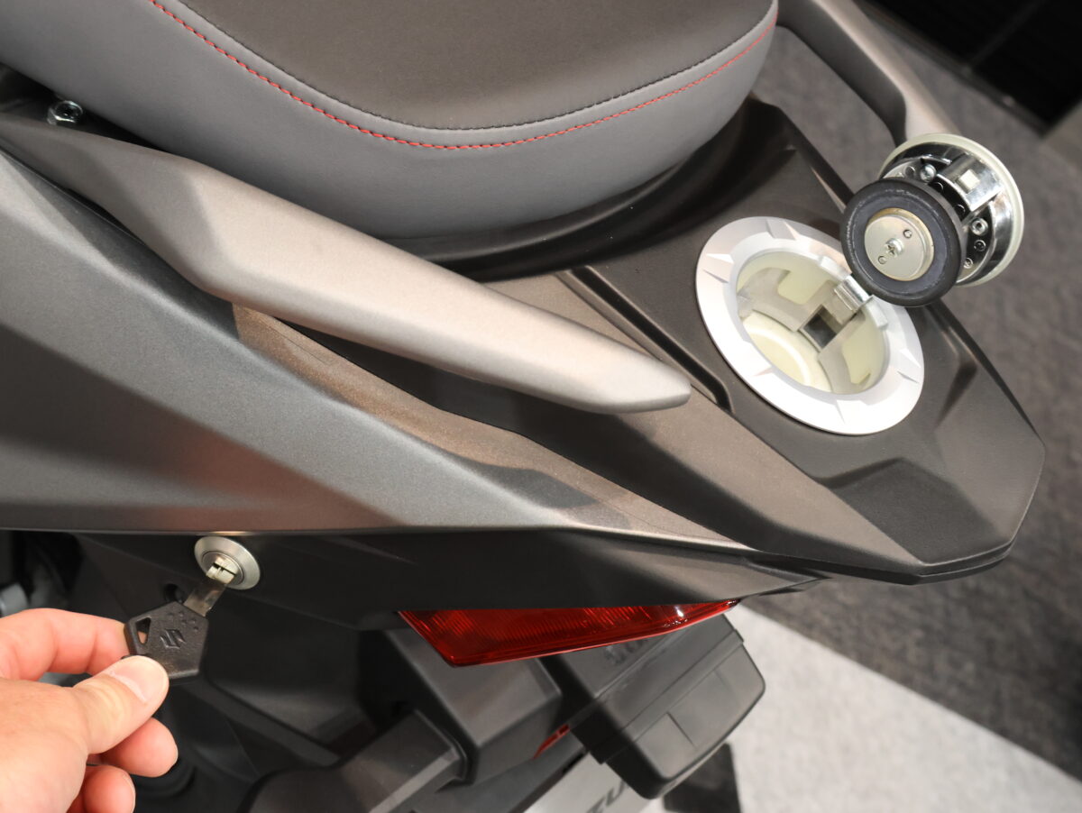 シート高780㎜で「アドレス125」よりも1cmほど高いのだが、シートの跨り部がより絞り込まれているので足着き性はいい。写真はでは若干踵が浮いてしまっているが、実際の足着き性の印象は「アドレス125」と変わらず。少し前に座れば両足とも踵までべったりとつけられる。