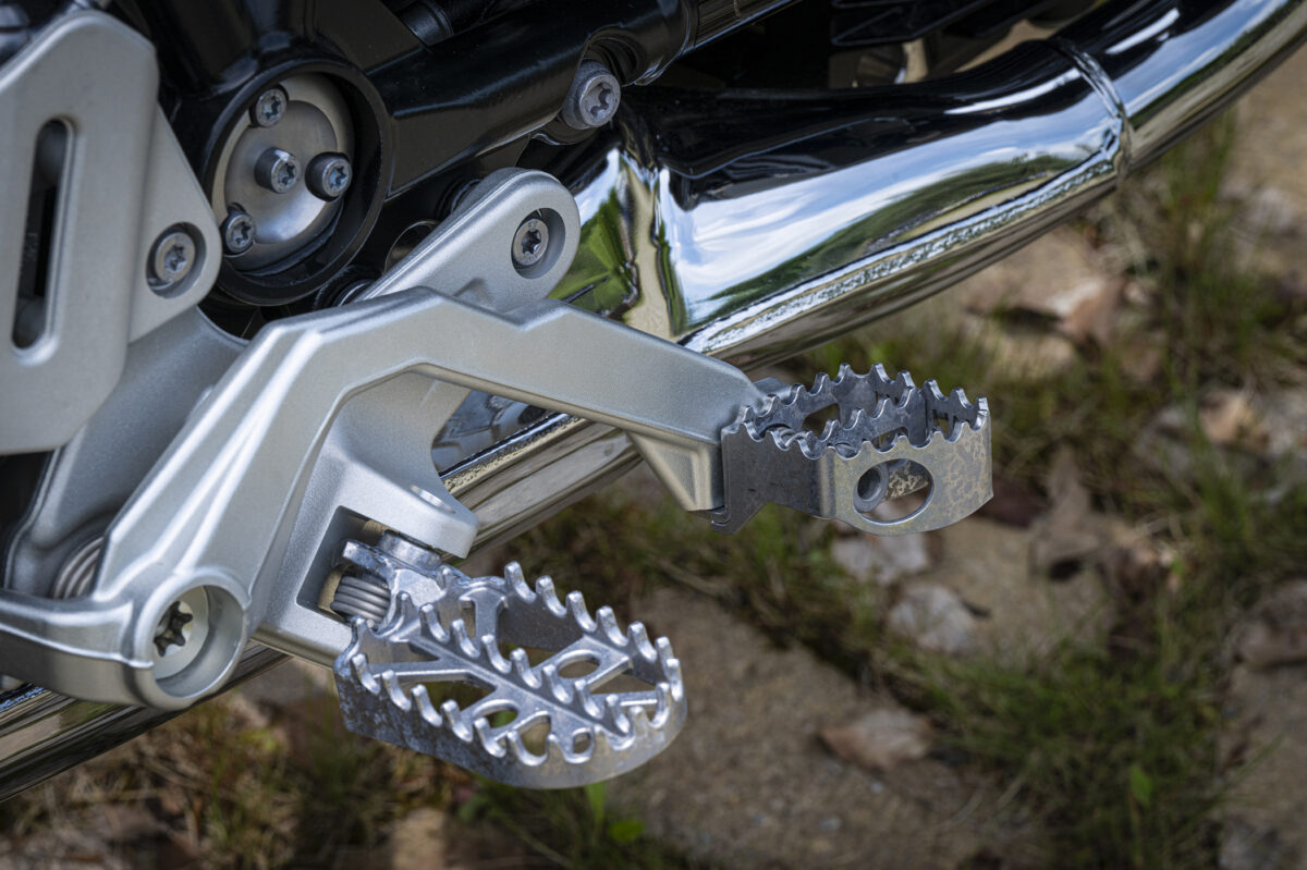 カルー4を前後に履くR 12 G/Sに乗って広いフィールドでウォームアップ。リアの車高が1インチ上がっただけですが、視界はさらに高くなった印象です。また、2cmアップのライザーが追加されていることもあってハンドルはかなり高め。小柄な体格だとハンドルがやや高すぎる、というのが正直な印象でしたが、いざスタンディングポジションを取るとそれはそれで乗りやすい。さらにワイドペグを採用する専用フットレストはオフロードブーツの使用が前提とあって、しっかりと車体をホールドできます。