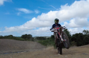 車体はアドベンチャーバイクほど重くはないものの、トレールバイクよりがフレーム周りの剛性は高め。そこに449cc単気筒のエンジンの強烈なトルクが組み合わせたことで、スロットル操作一つで路面をかきむしりながら前へ進むような迫力あるダート走行が楽しめる。
