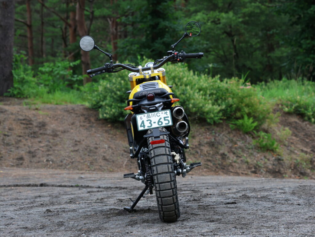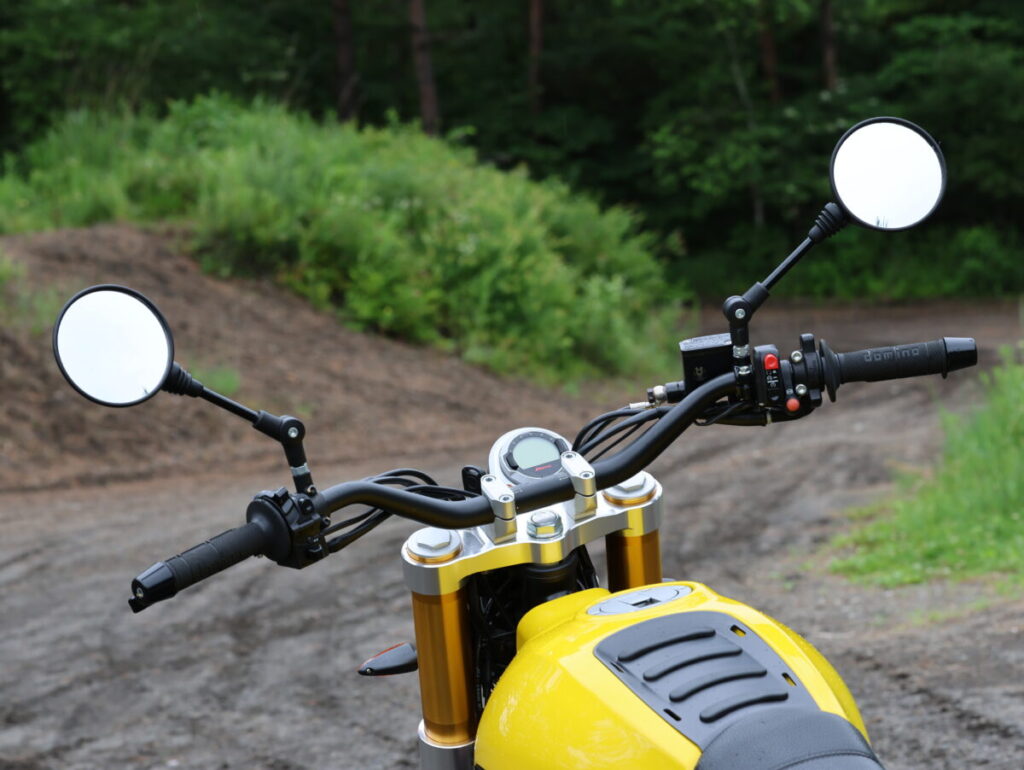 シート高820㎜とスクランブラー属としてはやや高めでサイド回しのエキゾーストパイプのため車幅はそれなりにあるが、単気筒のスリムな車体のおかげで身長:172cm 75kgの筆者の体格だと踵が数cm浮く程度。上半身のポジションもアップライトで普段使いからツーリングまで使いやすく、膝の曲がりもキツくない。