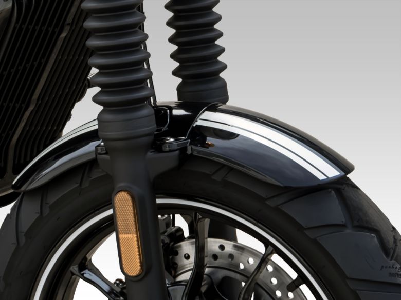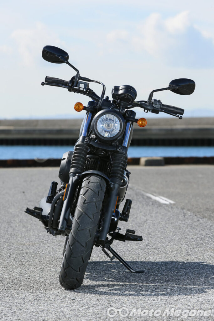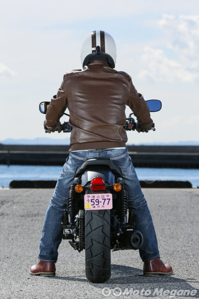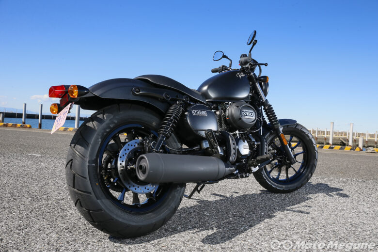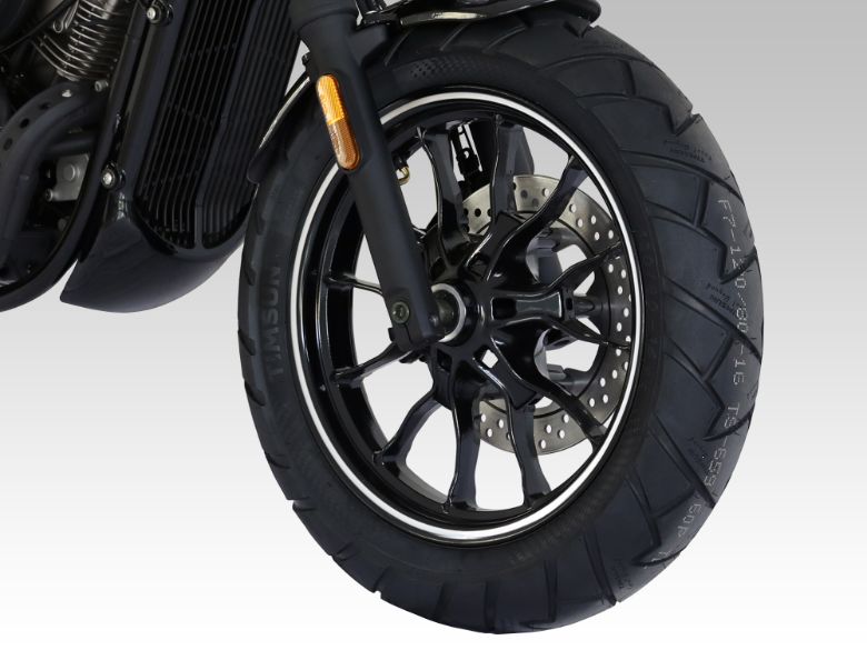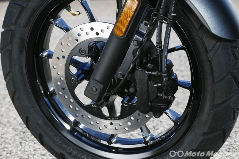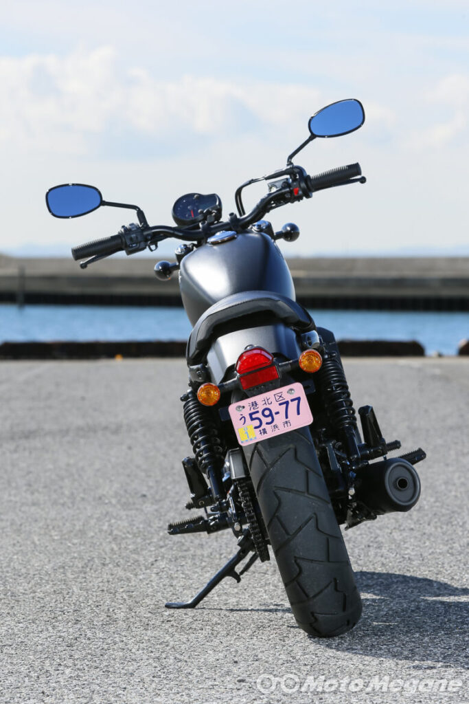 フォークブーツを標準装備した正立フォークと、ブラックアウトされたツインショックが組み合わされたサスペンションが安定した直進性と、低重心を活かした素直なハンドリングを両立。フロント16インチ、リア15インチのホイールには、ファットタイヤを装着している。