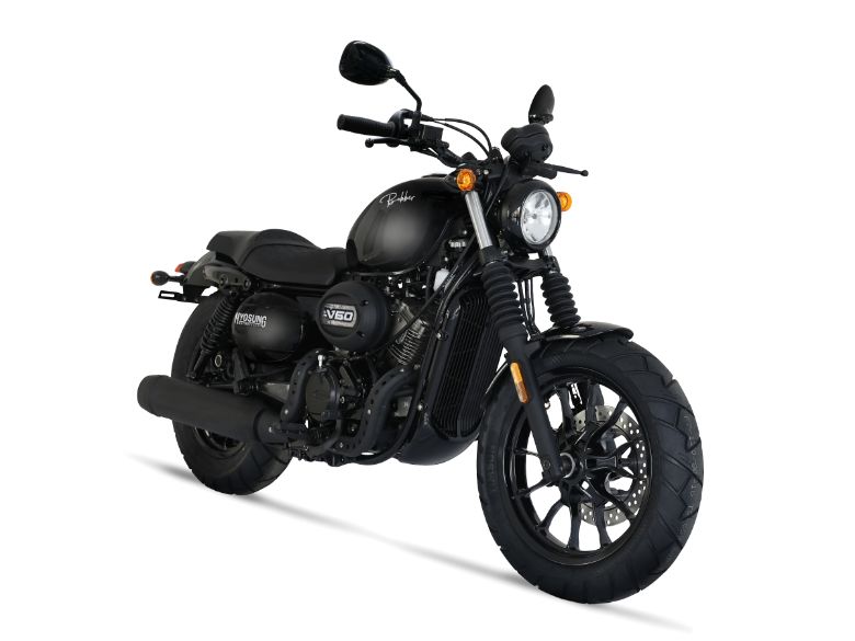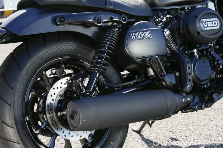 【ヒョースン GV125S BOBBER】●全長2080㎜/全幅750㎜/全高1050㎜/ホイールベース1425㎜/シート高710㎜ ●車重165kg ●水冷4サイクルV型2気筒SOHC3バルブ 124.7cc 13.5ps[9.9kW]/10250rpm 1.037kg-m[10.17Nm]/9250rpm 変速機5段リターン 燃料タンク容量12.5ℓ ●ブレーキF/R=ディスク ●タイヤF=120/80-16 R=150/80-15 ●ボディカラー:マットブラック ●価格:53万9000円
