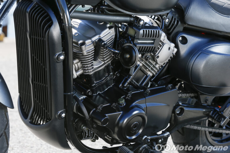 60度VツインのエンジンはSOHC3バルブで13.5馬力を発生。前後シリンダーのバンク角は従来エンジンの75度から60度に狭め、バルブシステムはDOHCに変えてコンパクトなSOHCを選択、1気筒あたり3バルブ(吸気2バルブ&排気1バルブ)を採用。冷却フィンを設けダークシルバーに塗装されたシリンダーヘッドの造形美が、Vツインの存在感を際立たせている。また、新技術としてシリンダーにはMONOブロック(メッキレス高シリコン含有アルミ剤使用)を採用。冷却性向上による出力アップ、耐久性向上、排ガス抑止などの効果を実現している。なお、新排ガス規制EURO5に適合している。