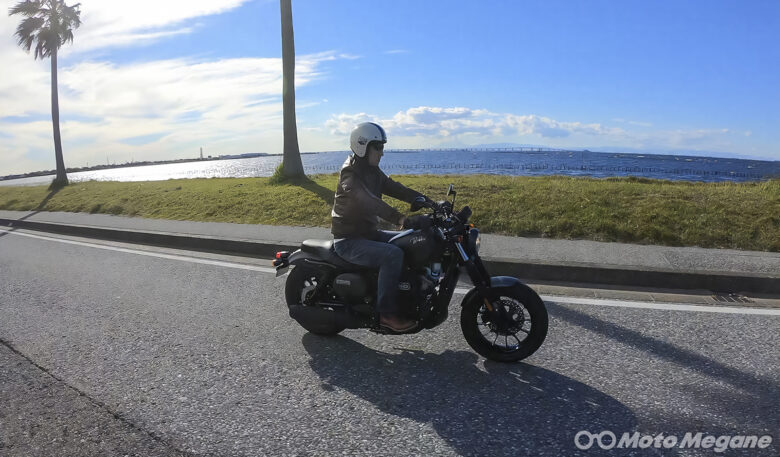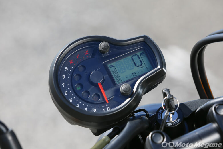 肝となるVツインエンジンは、適度なパルス感を伴ったサウンドで、振動もシングルに比べて小さめ。レッドゾーンの始まる1万rpmまでストレスなく回ってくれる。もちろん車重が165kgと少し重めなので、速い!と感じる加速ではないが、周りの交通をリードできるレベルの加速は十分にこなしてくれる。