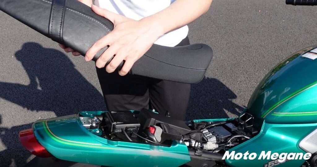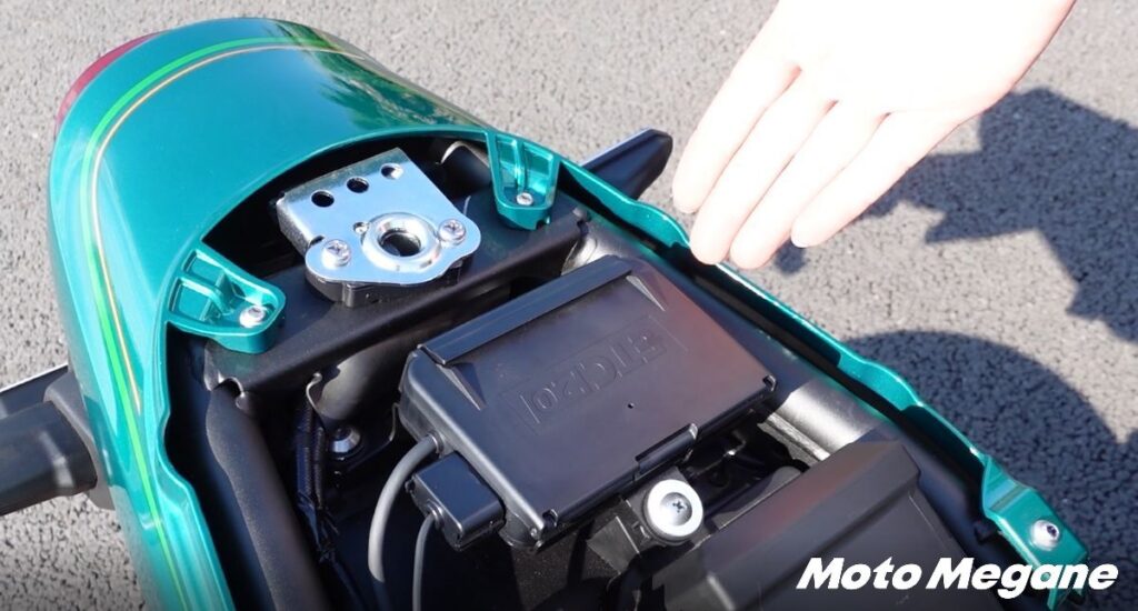Z650RSはETC2.0車載器を標準装備しており、配線がごちゃつくこともなくシート下にきれいに収まっている。