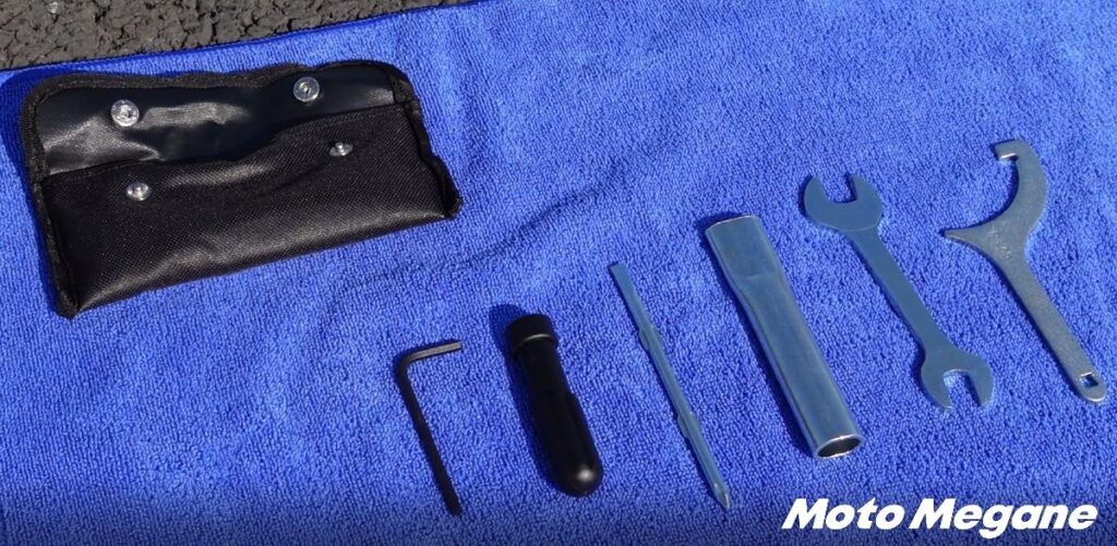 車載工具はヘキサゴン、レンチ、+-ドライバー、プラグレンチ、フックレンチが収納袋に入っている。