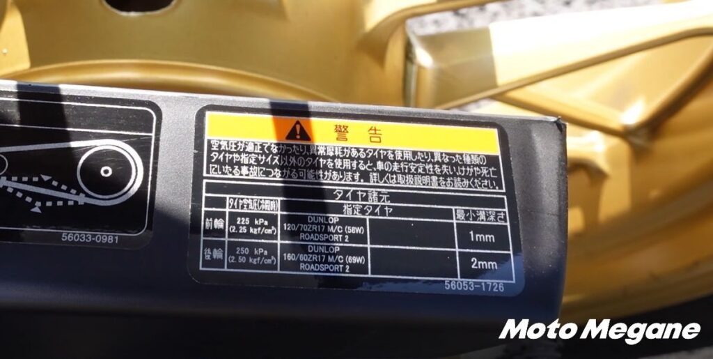 | リア | MT/4.5 | 160/60ZR17 | 2.50kgf/cm² | チューブレス/ラジアル |
