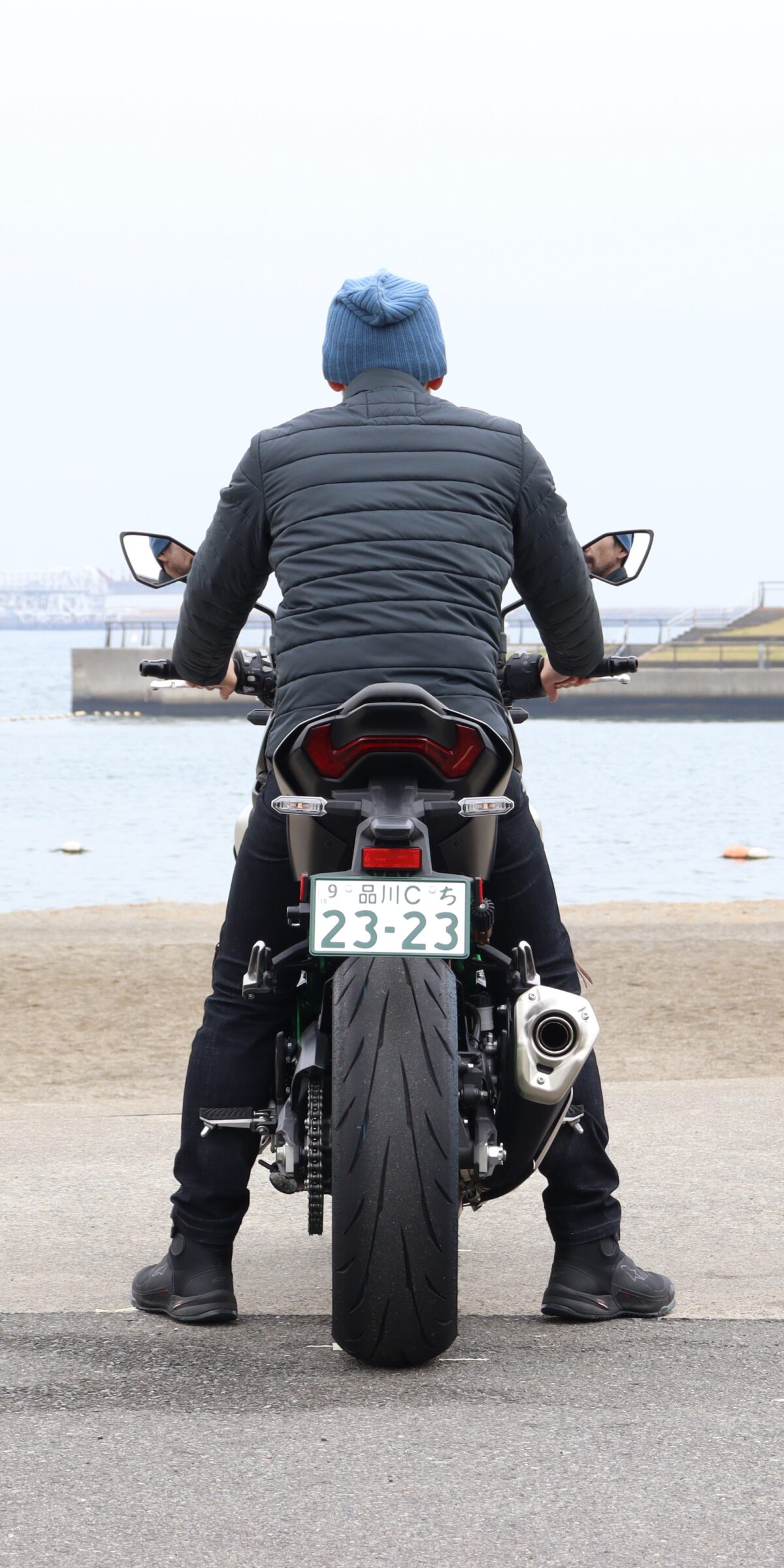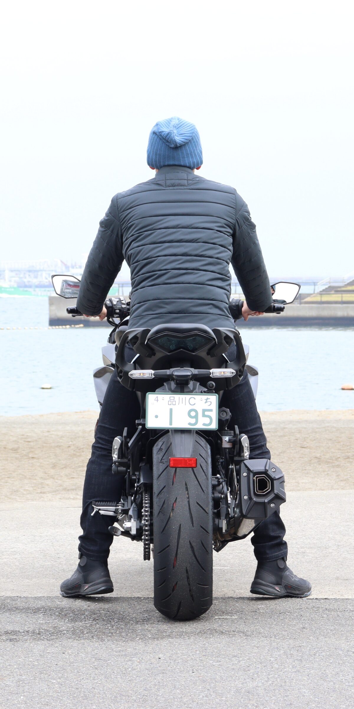ストリートファイターらしい自然なポジション。幅広ハンドルのおかげで上体の自由度が高く、街乗りの適性は一番高そうだ。ハンドルは見ためより前方でやや遠く、適度な前傾姿勢になる。スポーツバイクらしく、ニンジャ1100SXよりも前傾はやや強めだ。