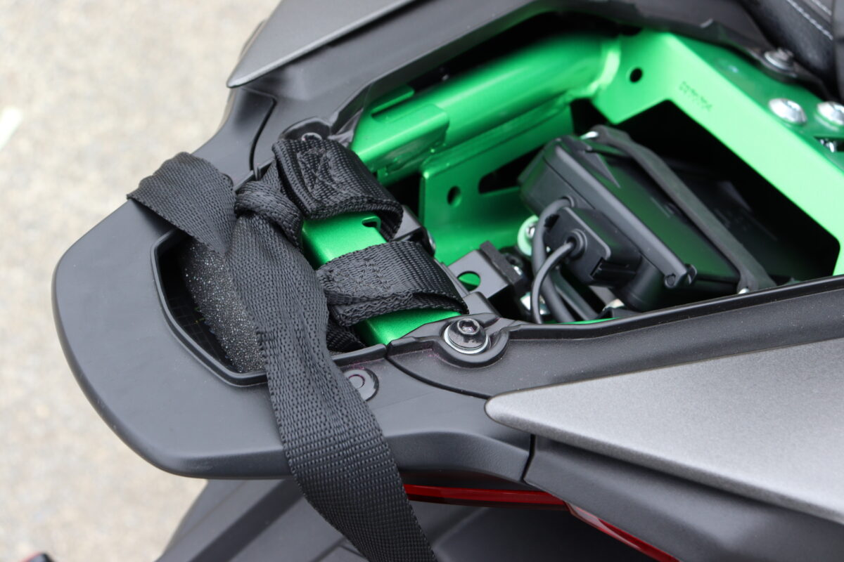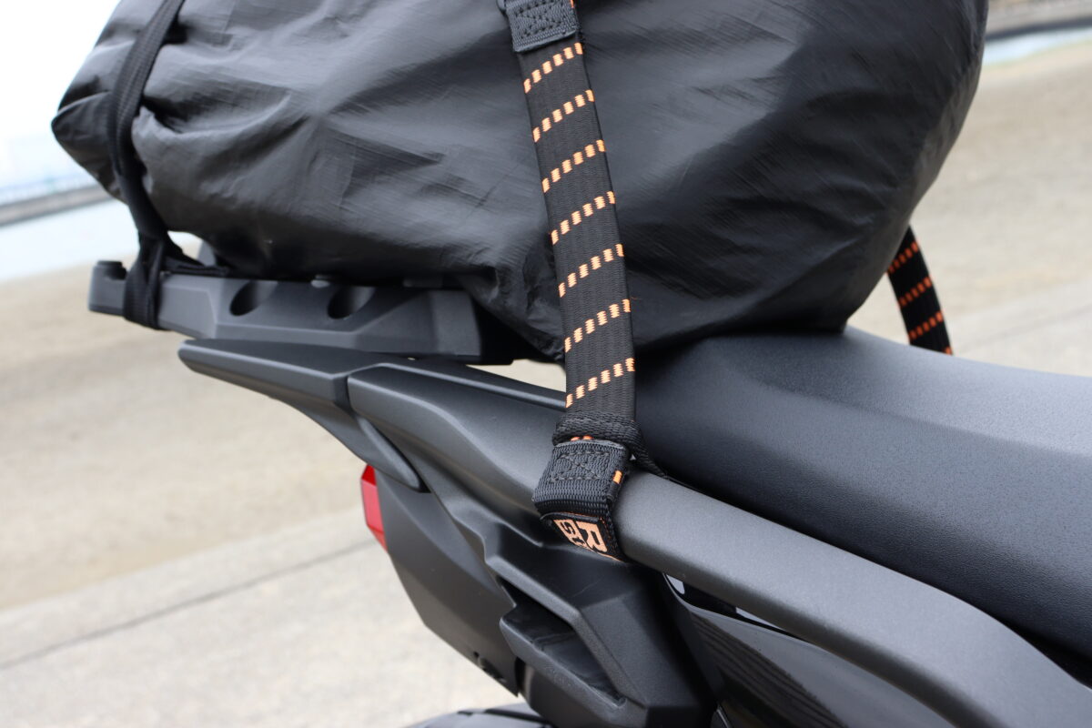 ベルトをかけるためのフックポイントがほとんどない。シートを取り外してシートレールにベルトを通す必要がある。ただ、タンデムシートは平面に近い形状のため荷物は安定するだろう