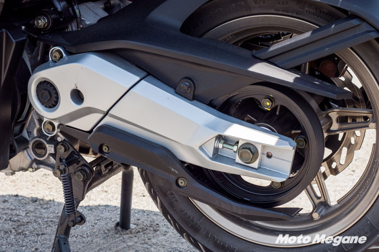 一般的なスクーターは駆動系をスイングアームに見立てるユニットスイングを採用するが、TMAX560はスイングアーム方式を採用している。