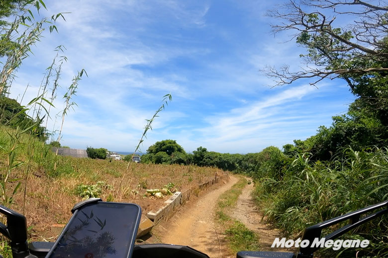 未舗装路で凹凸が激しく狭い道がしばらく続くが、KRV180はトラクションコントロール装備で車両も軽快なため臆せずに突っ込むことができた。