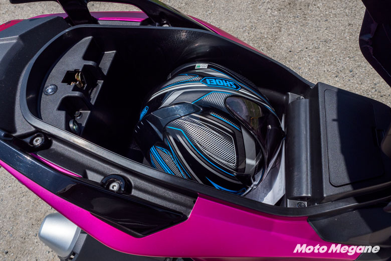 シート下スペースは筆者愛用のフルフェイスヘルメット(Mサイズ)を横にしてギリギリ入る程度だ。