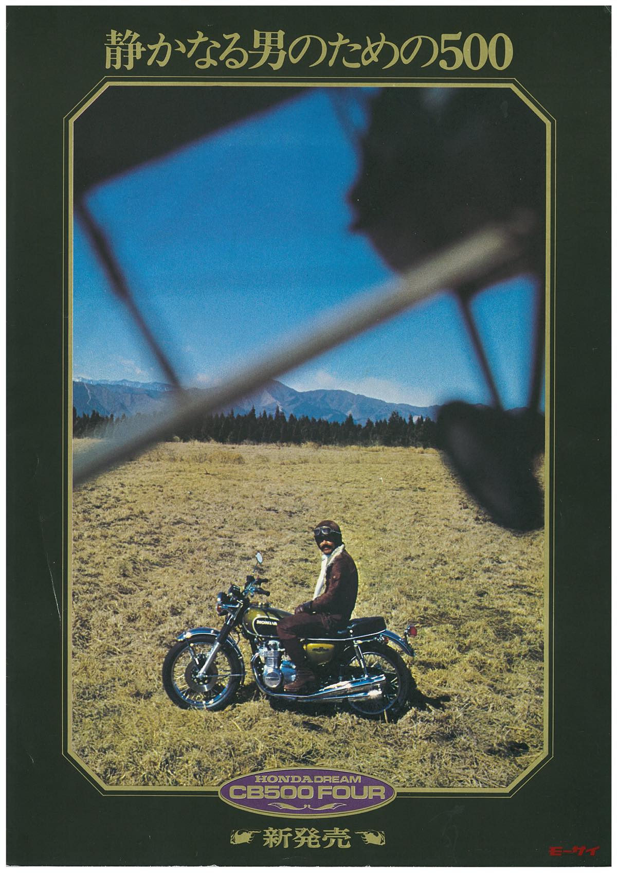 また動力面では、冒頭のキャッチフレーズ「静かなる……」にも重点が置かれ、エンジンは「静粛かつ振動の少ない4気筒」で、4本出しマフラーには当時のヒット曲(洋楽)からの引用と思しき"サウンド・オブ・サイレンス"のキャッチフレーズに続き「CB500FOURは騒音を嫌います。粛々と廻る4サイクル4気筒エンジンとともに、そのエキゾーストノートもまた低く、静かです。爆音を轟かせて性能を誇示するような空しいデモンストレーションは必要ありません」と書かれる。