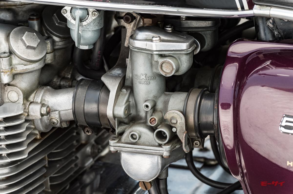 ■キャブレターは強制開閉式4連の京浜製PW22を採用。スロットルバルブ開閉には独自のリンク・連結機構を採用し、特に閉じ側を独立した2系統の戻し機構として、確実なスロットル操作をねらった。