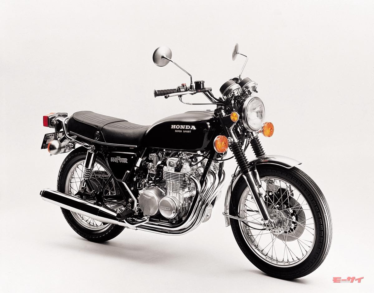 ■CB550FOUR(1974):500からボア+2.5mmの544ccに排気量アップされ、最高出力2psアップほか、高いトータルバランスを維持して登場の550フォア。