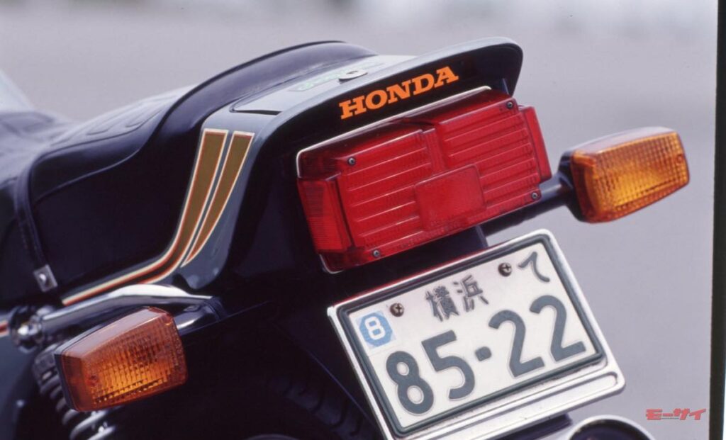 特徴的なテールデザイン。ウインカー/テールレンズともにサイズは大型。これも当時の保安部品の安全性基準を反映したものだろう。 テールカウル上部にはキー開閉式の小物入れが装備される
