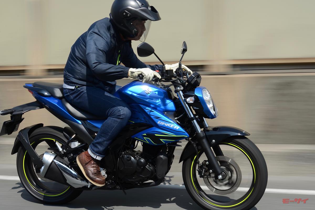テストを行ったのは2023年モデルのジクサー150で、色は鮮やかなトリトンブルーメタリック。走行距離は750km程度という、ほぼ新車に近い状態の個体だ。実車を前に眺め、またがって感じるのは、車体は軽快そうで取り回しも軽いのに、車上から見える風景は「意外に立派」ということ。小さな排気量のモデルの割にアイポイントが高く、ライダーがホールドした具合も相応のボリュームがあって意外に堂々としている。