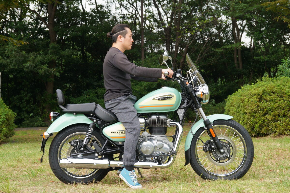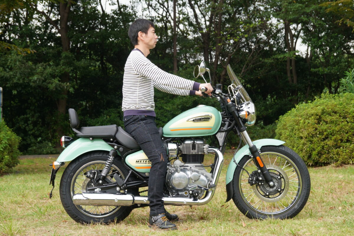 メテオ350は車重がやや重いものの、低重心設計のおかげで押し引きの負担が軽減され初心者にも扱いやすい。シート高の低さも安心感を高めてくれる。