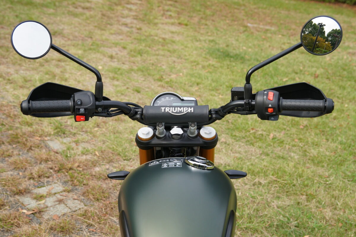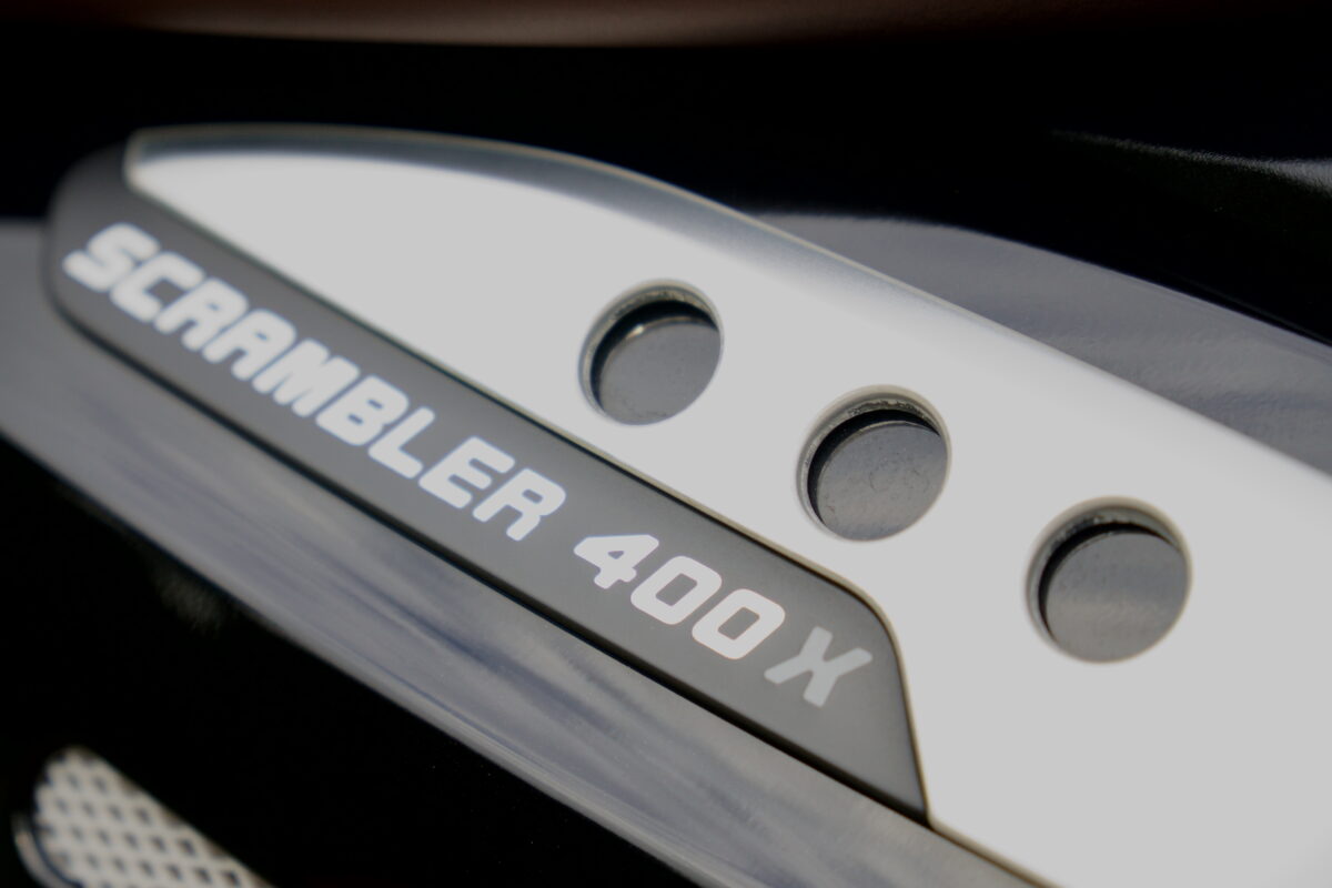 スクランブラー400Xはオンロードとオフロードの両方を視野に入れたスポーティな設計で、ややアップライトなポジションが採用されている。オフロードの荒れた路面でタイヤが取られたとしてもバランスを取りやすいようハンドル幅は広く設定されている。小柄なライダーやオンロードモデルにしか乗ったことがないようなライダーにはネイキッドモデルのようなバーハンドルながら、よりワイドなポジションのため多少の慣れが必要かもしれない。オフロードバイクのシッティングポジションのように、シートの前方に座るよう意識すると腕も伸びきらずライディングしやすい。