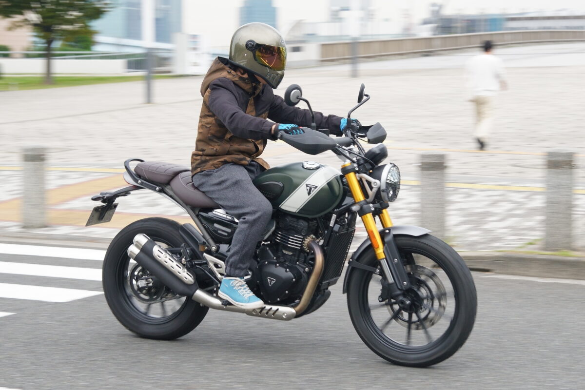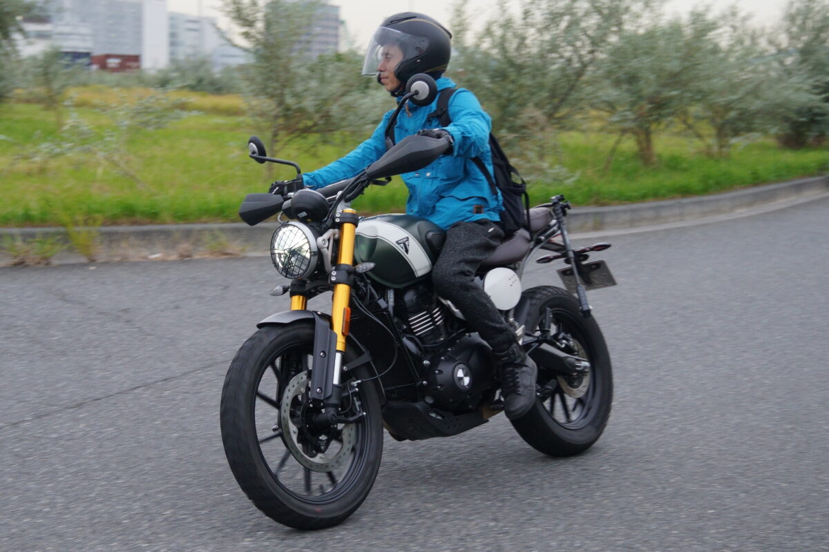 スクランブラー400Xは軽快なレスポンスが最大の魅力。スロットル操作に対しての反応もよく、ストップ&ゴーの多い市街地からワインディングまでスポーティな走りを堪能できる。キビキビした走りをバイクに望んでいるのなら、スクランブラー400は最適。レトロな雰囲気のオフロードヘルメットを被り、バイクに合わせたファッションを楽しみたいという人にもオススメだ。
