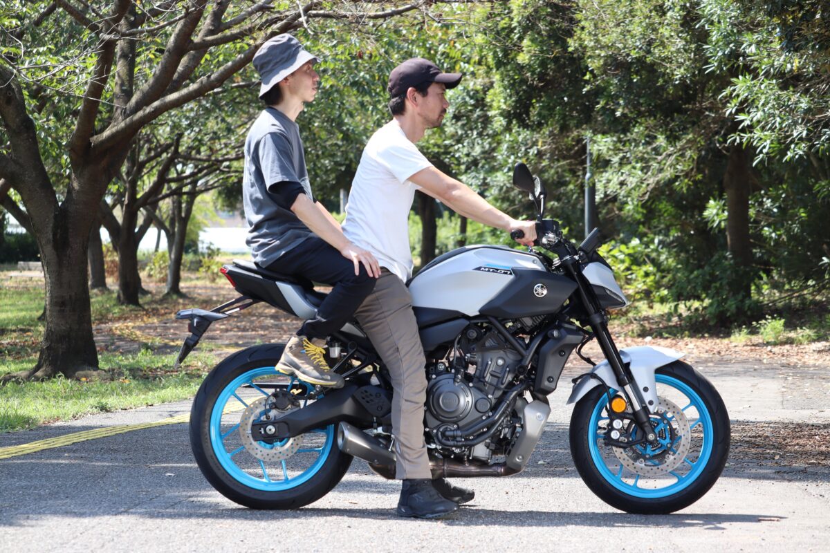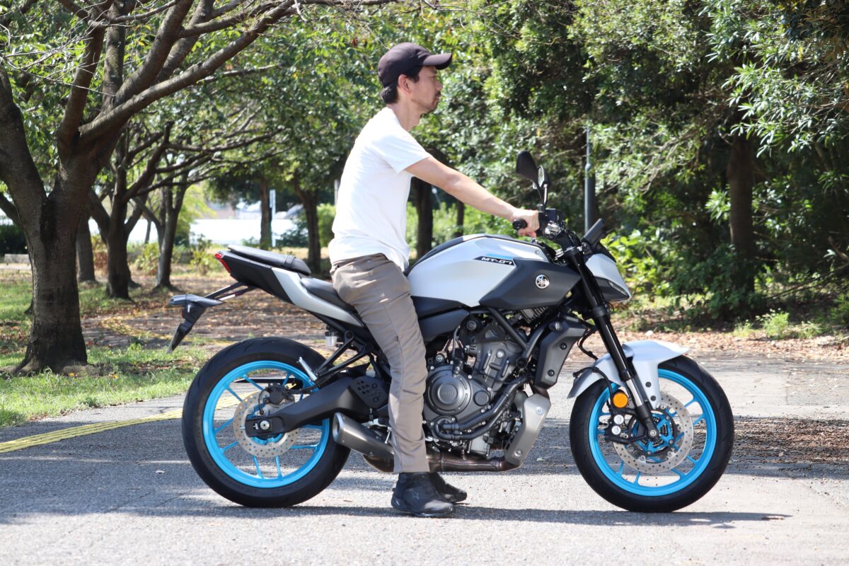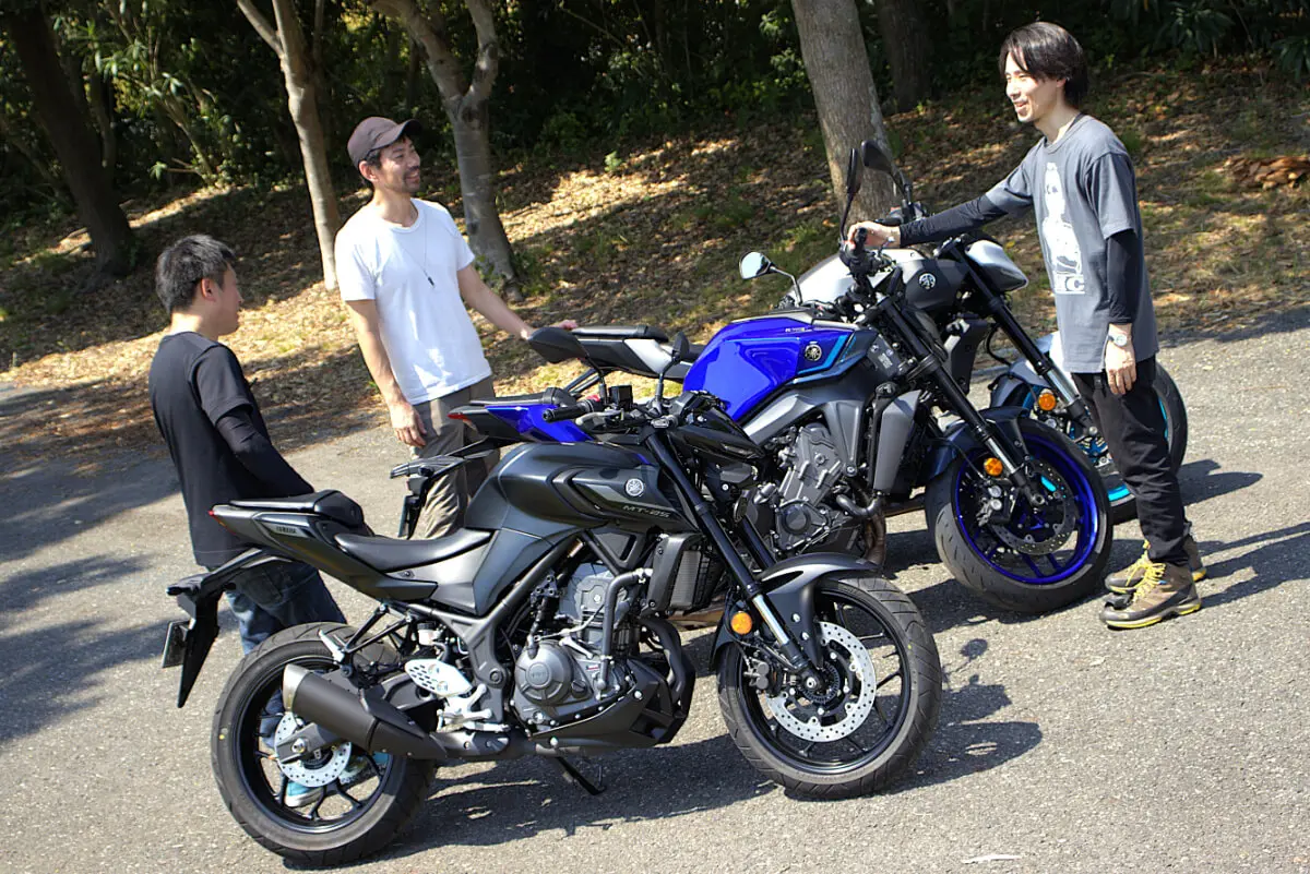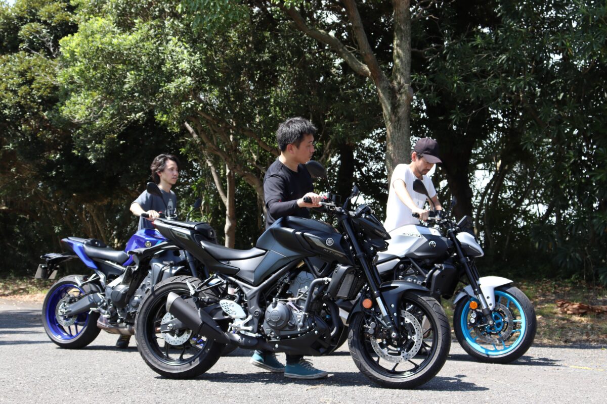 MT-25は軽快で小まわりが利くため初心者でも安心して取りまわせる。MT-07は重量を感じるものの、車体の幅が抑えられているため押しやすく、ライダーが力を入れやすい。MT-09はさすがに押し出しに力が必要で、ハンドルを切り返す時の慣性が大きく、細かい取りまわしは少し苦労するという意見も。