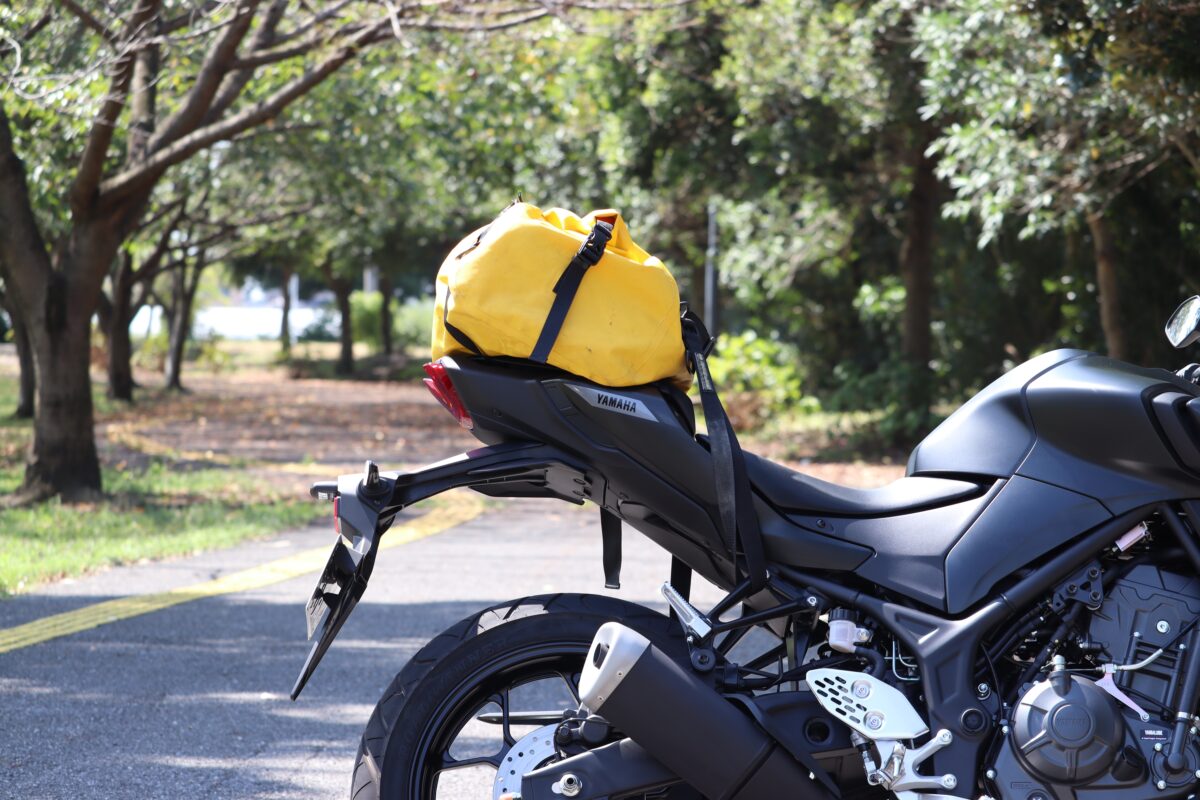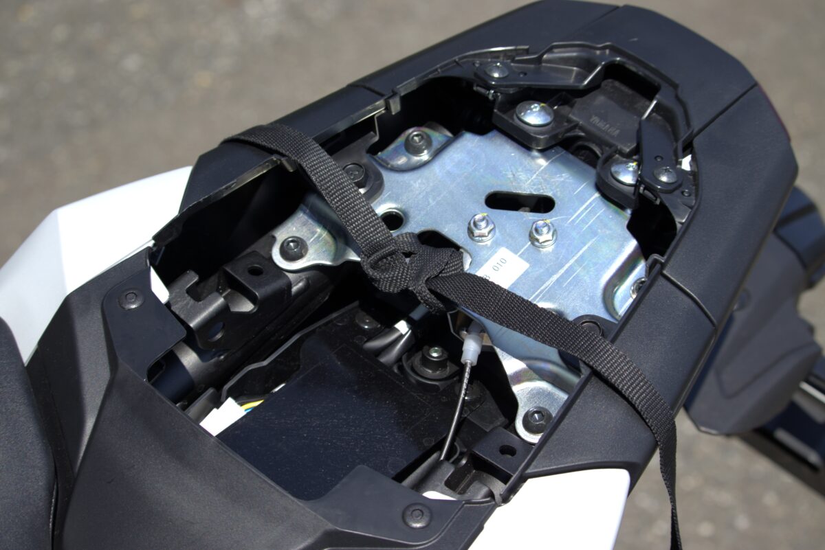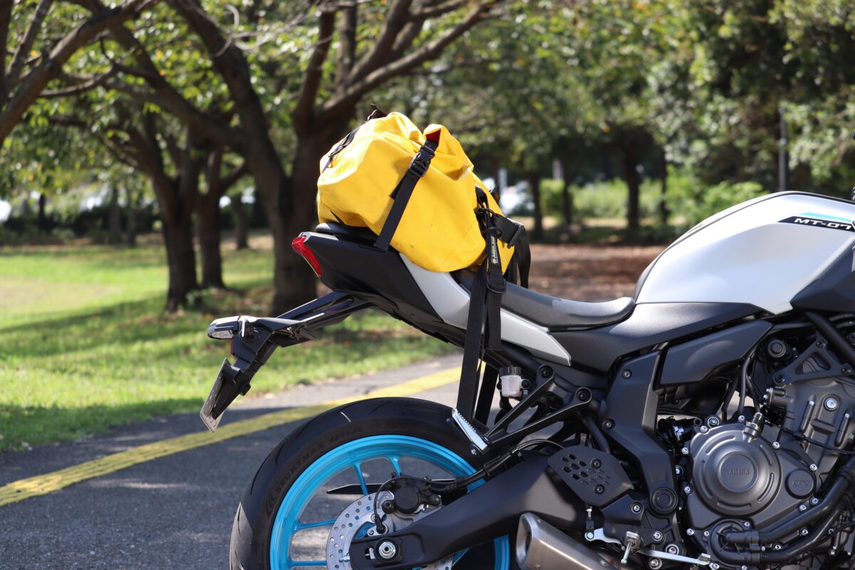 なおMT-09は、タンデムシートを外した際に見えるシートフレームにバッグを固定するサブベルトを通そうと試みたが、どこにもベルトを通せるすき間が見つからず断念……。MT-09のみ荷物を積載した項目が存在しないのはそのため。MT-09に荷物を積載するなら、ドラムバッグをロープ等で固定するのではなく、シートへ固定する仕掛けがあらかじめ用意されているシートバッグを用いたい。