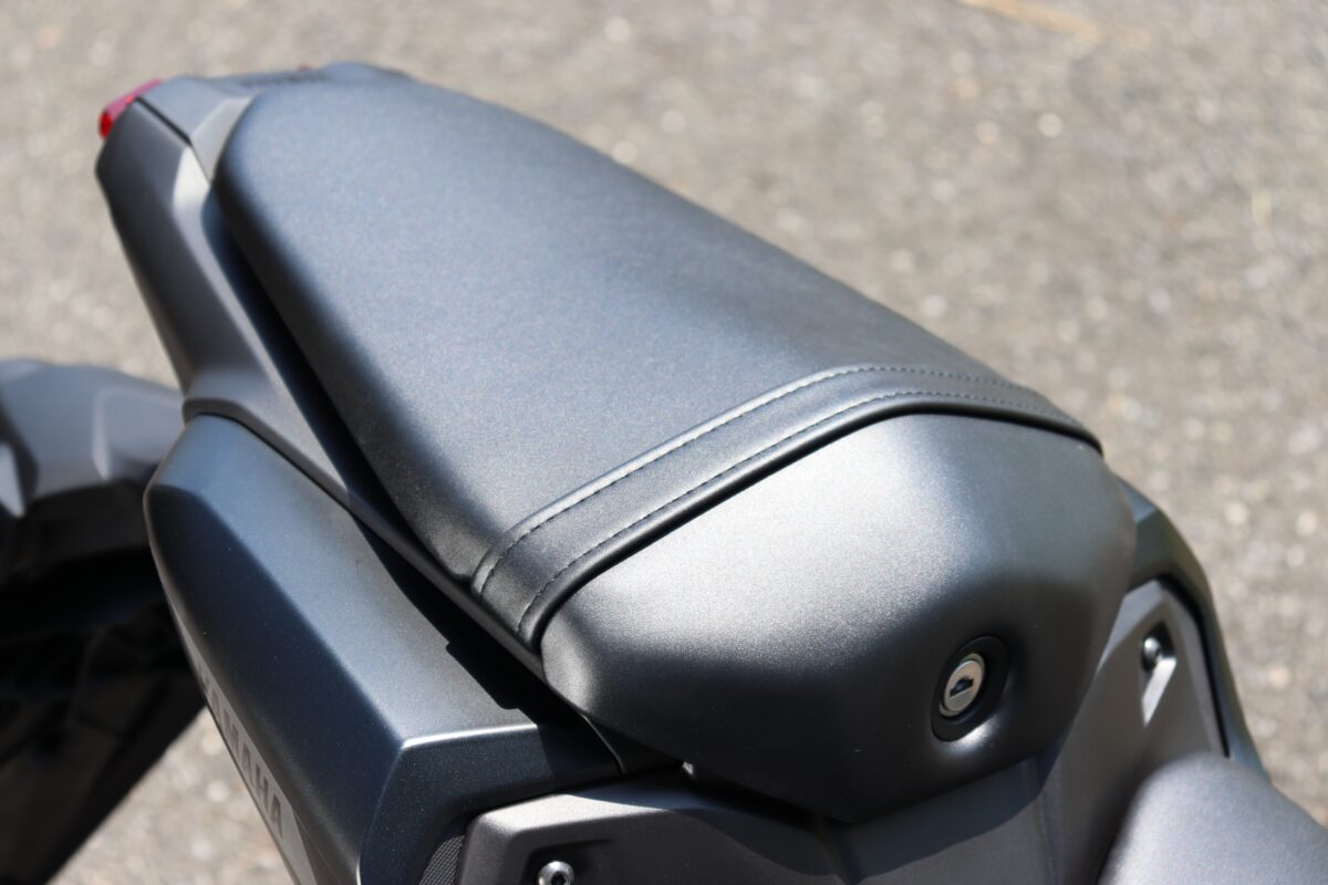 まずはシートの形状から。単純なシートの高さを比べると低い順からMT-25<MT-07<MT-09だが、この数値は参考程度にしてほしい。シートが高くても座面が絞り込まれていれば足を真下におろせるため、足つきはよくなるからだ。