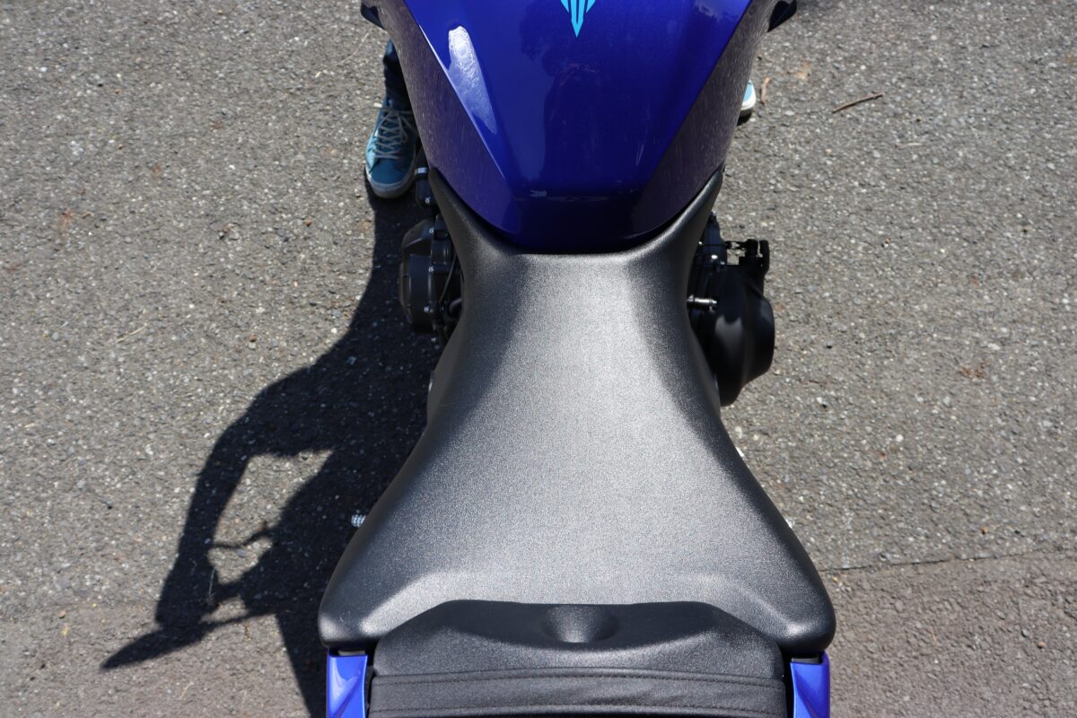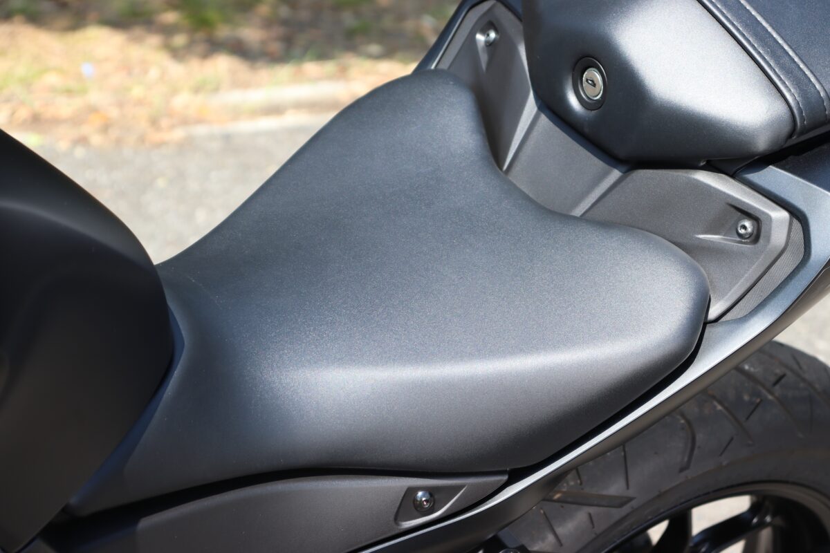 タンデムシートの高さは3車ともほとんど変わらないので乗り降りのしやすさは同じ。ライダーシートの高さはMT‐25がもっとも低いため、タンデマーの視界を広くとれる利点がある。