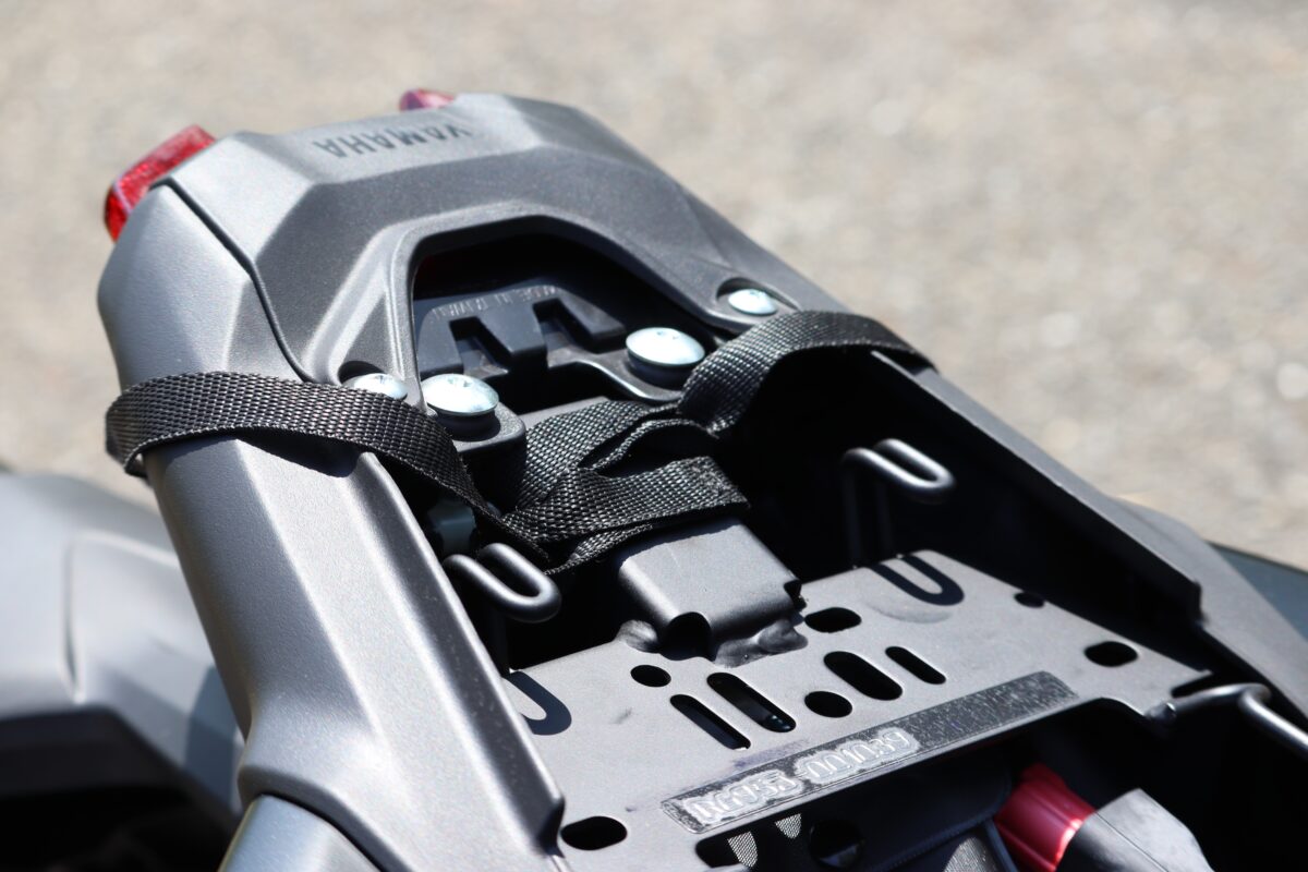MTシリーズに限らず現代のスポーツバイクはリヤまわりをコンパクトにする設計が主流なため、小さな荷物なら問題ないが、ツーリングバッグなどの大きな荷物だと相性がイマイチ。