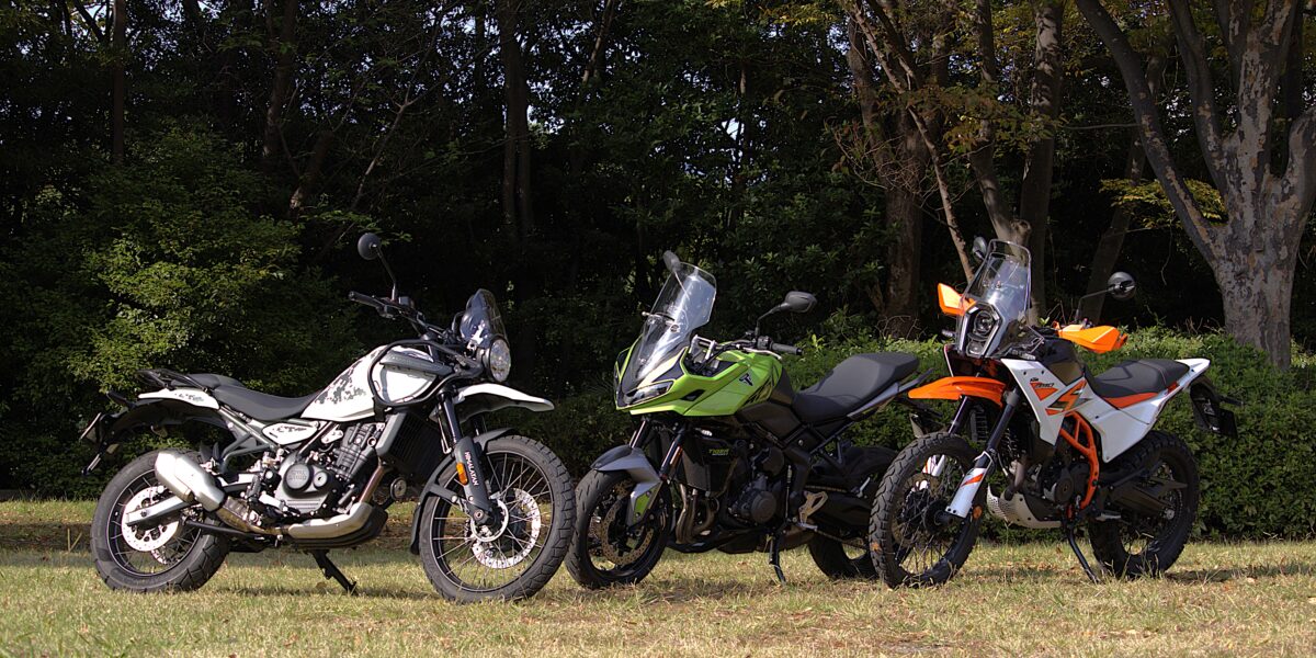 前回の前半パートではトライアンフ・Tiger Sport 660/ロイヤルエンフィールド・New Himalayan/KTM 390 ADVENTURE Rの3台を比較して、足つき性や取りまわし、積載性能などの「使い勝手」をチェックした。