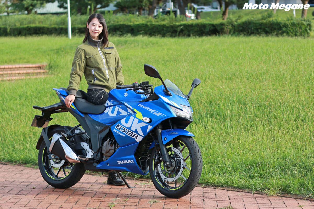 撮影当日、実際にバイクを前にした第一印象は、コンパクトにまとまった車体は装備重量158kgという軽さも相まって取り回しやすく、流曲線が美しい端整な顔立ちのフロントマスクから流れるようなフルカウルのデザインが全体をスタイリッシュかつスポーティな印象。早速エンジンを始動してみると、なんとも『スズキらしい』乗り手の気持ちを底上げさせるような心地良い排気音が響き渡り、走り出す前から期待値を高めてくれます。